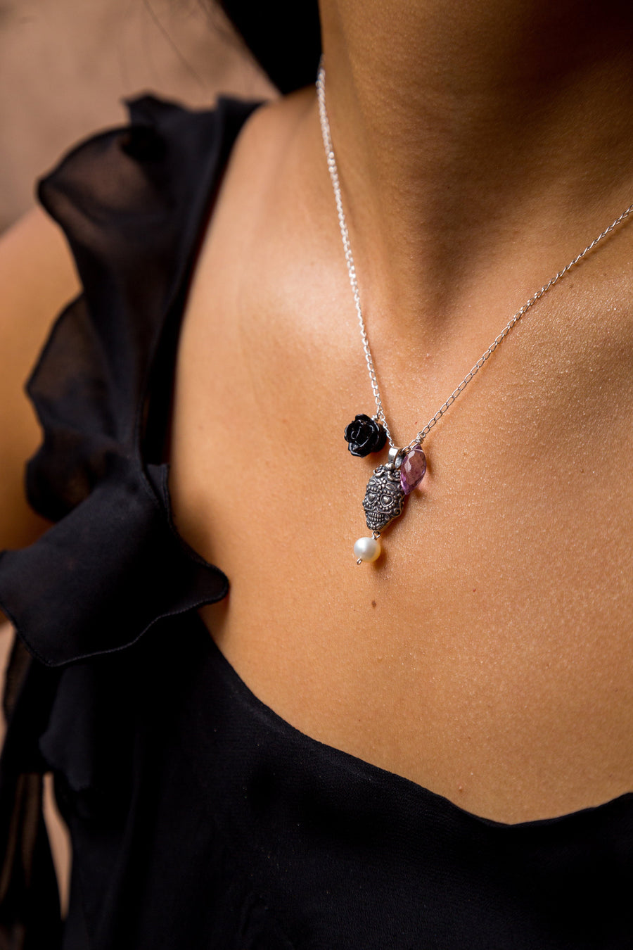 Dije de calavera con amatista, perla y rosa negra de resina.