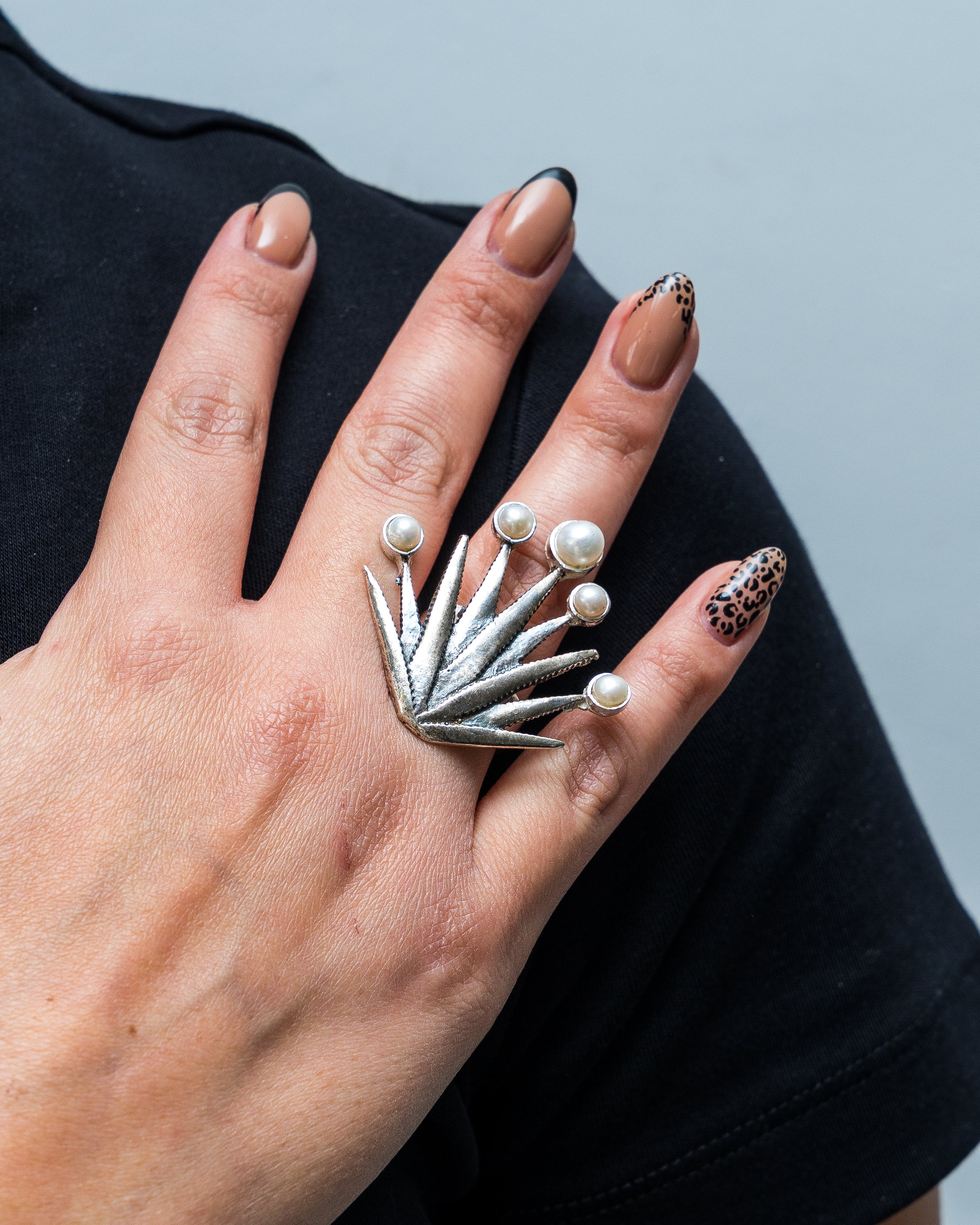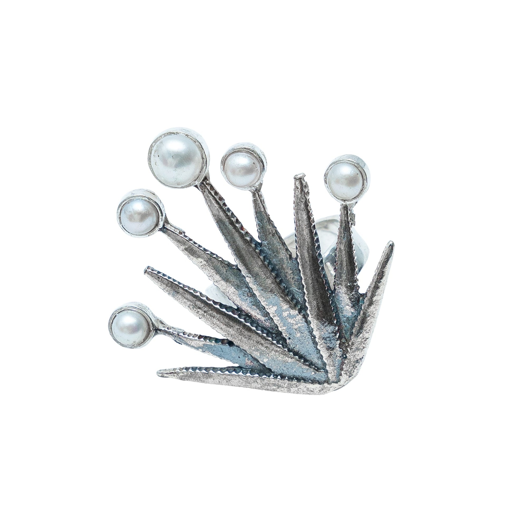 Anillo conformado por Agave Realista con cinco cabuchones de perlas biselados sobre las pencas.
