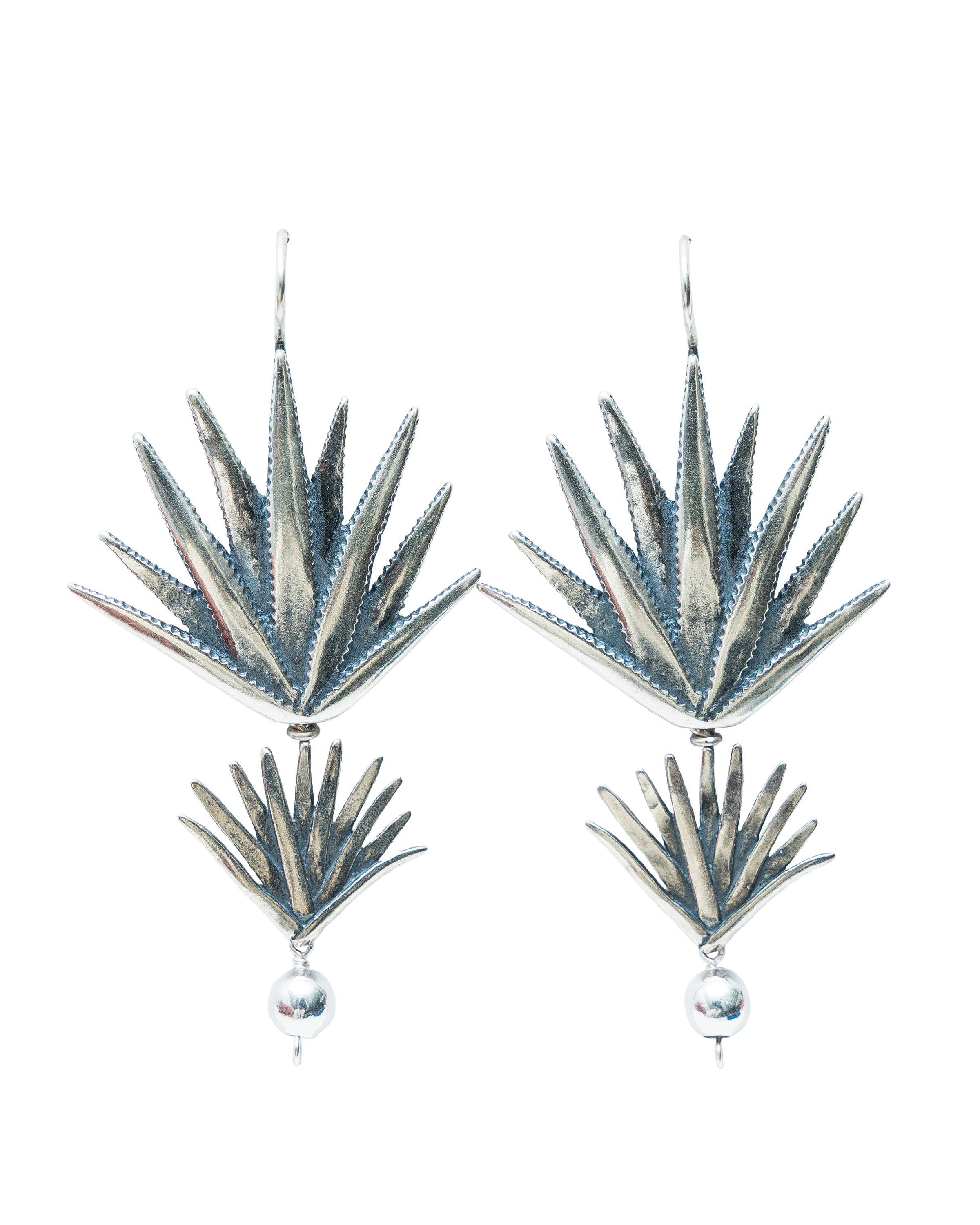 Aretes de arillo conformados por agave realista y agave sueño 4 con una esfera de plata engarzada.