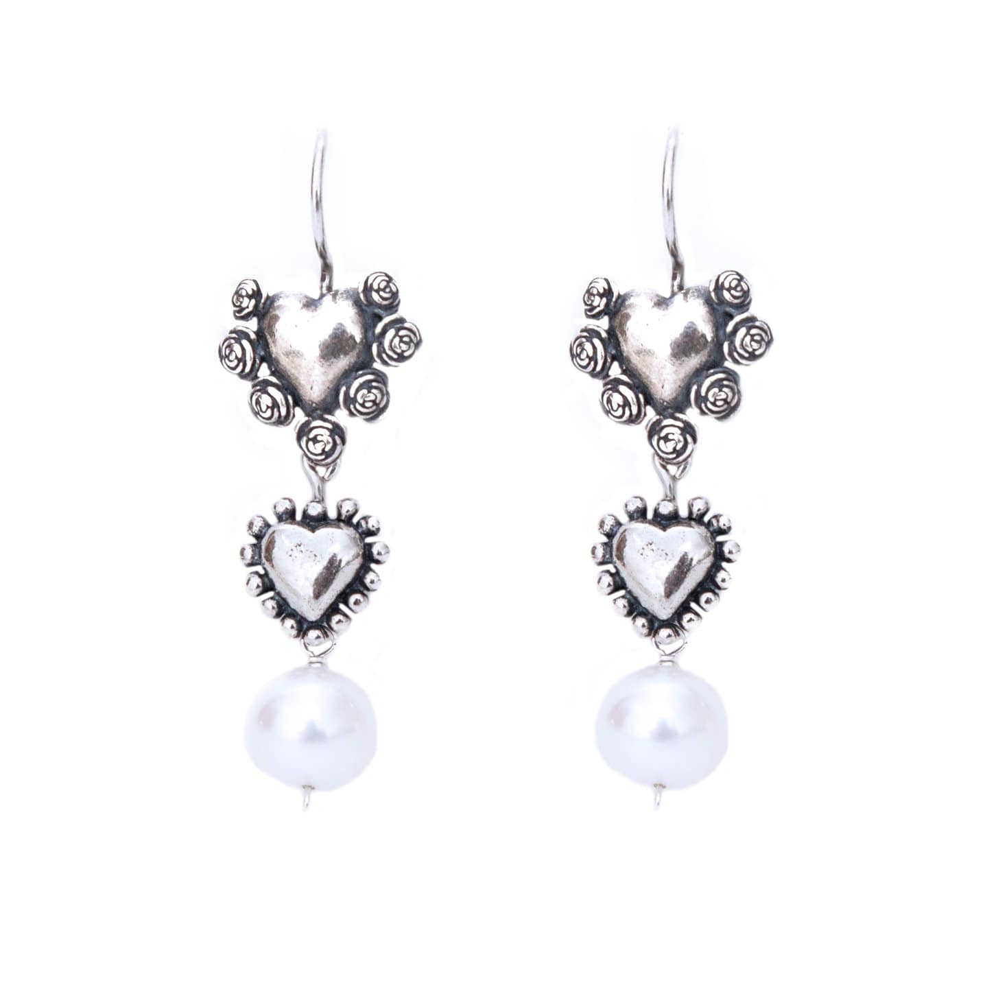 Aretes de arillo con corazón con rosas y corazón con puntos con una gema natural perla.