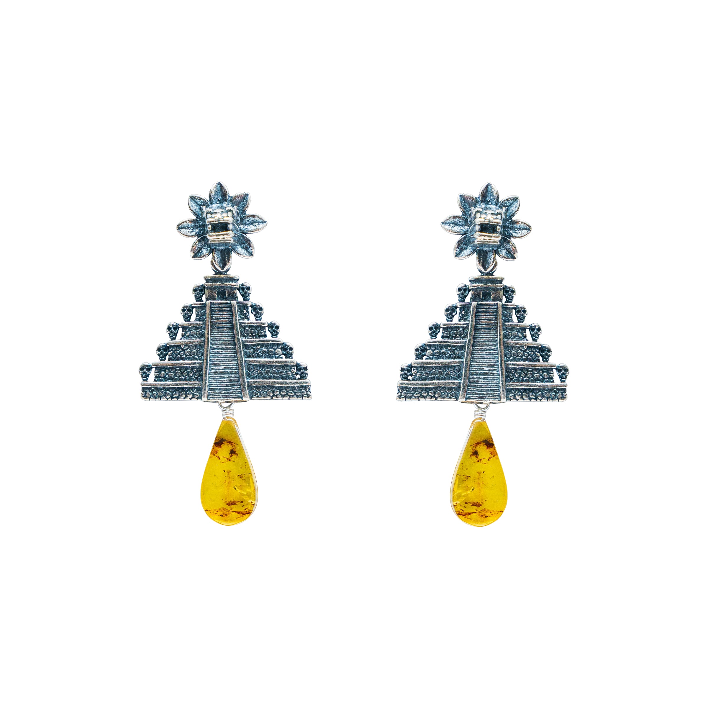 Aretes de poste pirámide con Kukulkán y una gota de ámbar engarzado en la parte de abajo en cada uno.