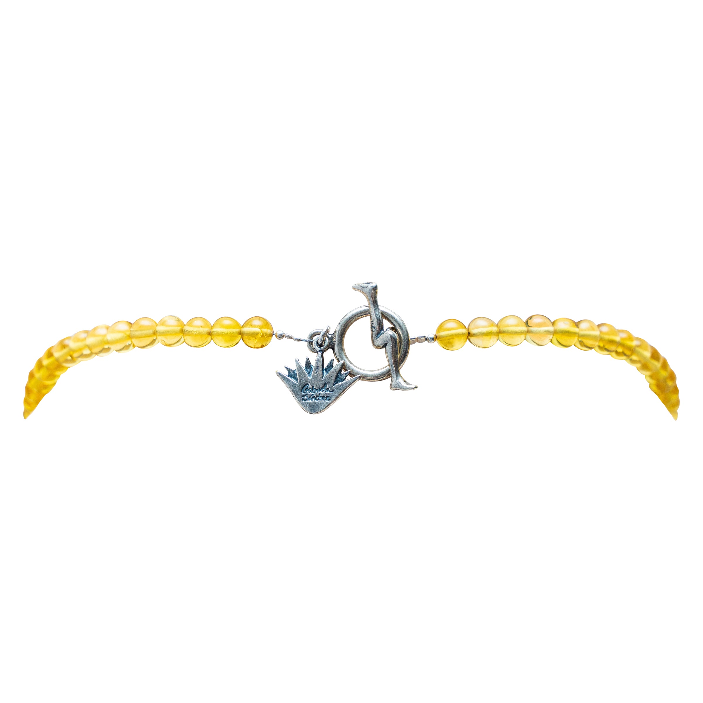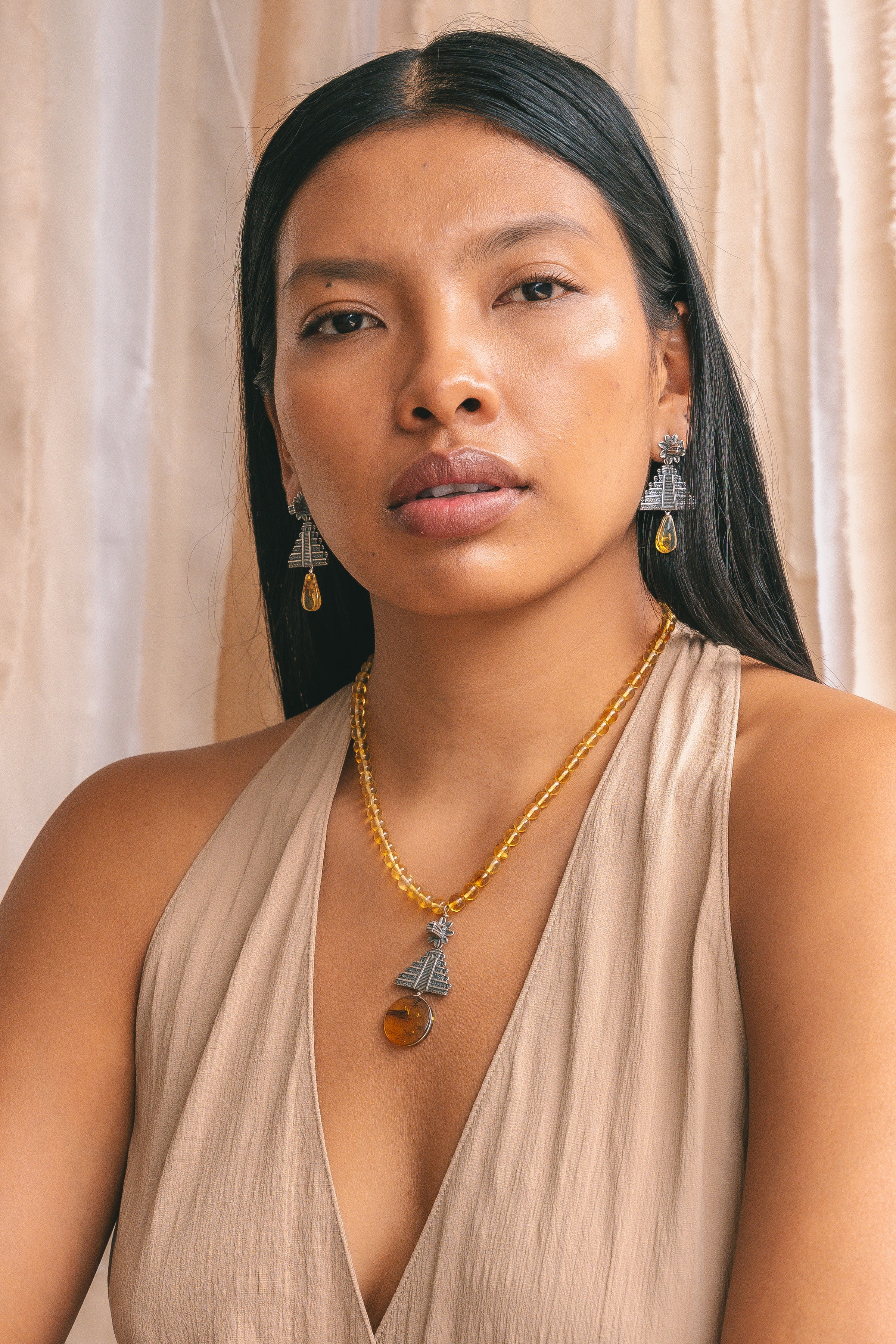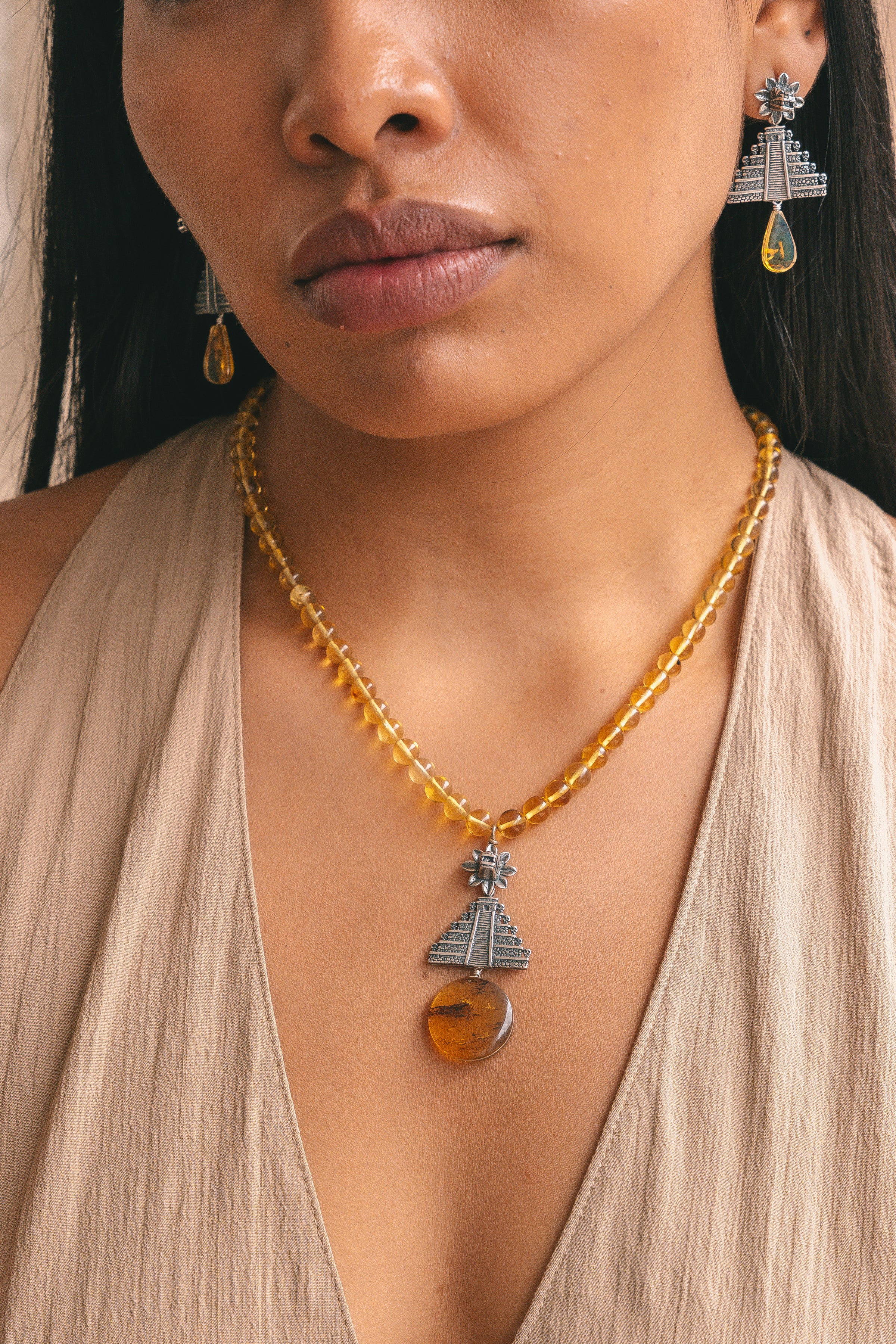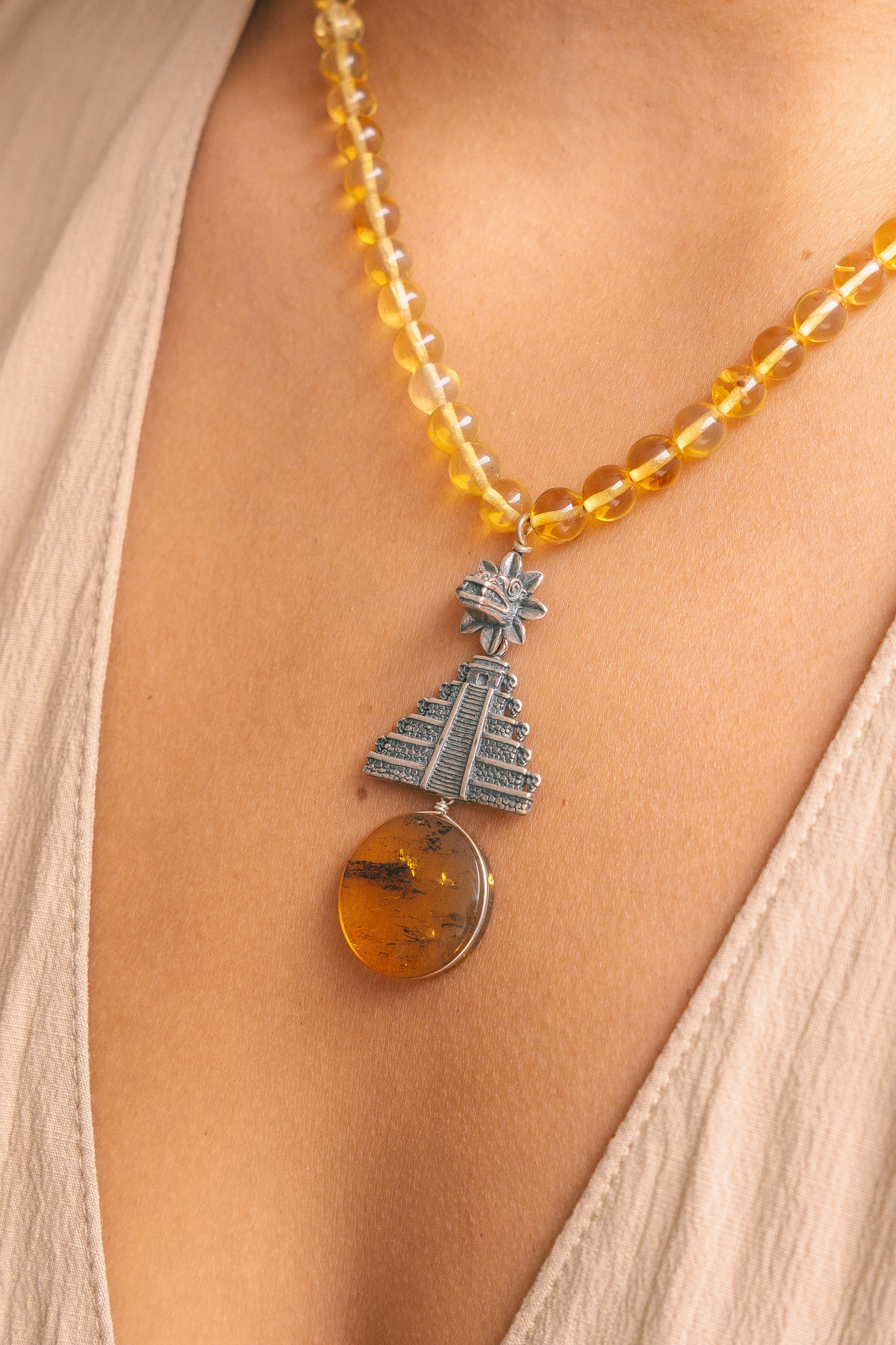 Collar formado por un hilo de ámbar, complementando con una pirámide del Kukulkán y un ámbar circular engarzado en la parte de abajo.