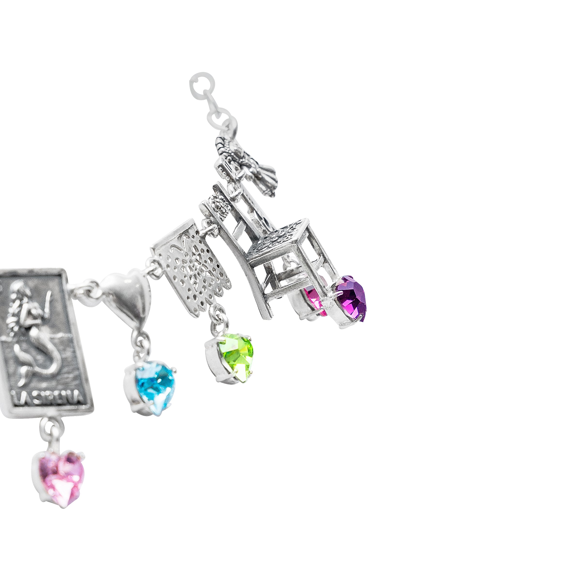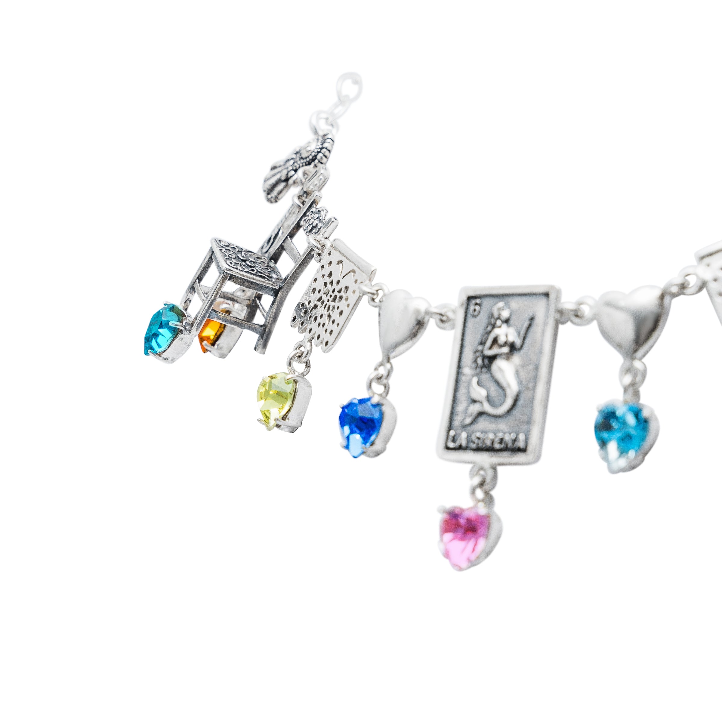 Gargantilla con broche de perico, terminación en cadena. Piezas de plata: Dije Central carta de lotería La Sirena con un corazón swarovsky rosa baby, dos corazones salud con corazón de swarovsky con tonos azul cielo y azul eléctrico, dos papeles picado de mariposa con corazón de swarovsky con tono verde pera y limón, dos sillas con flores con corazón de swarovsky con tonos verde azulado y uva, dos guitarra con corazón de swarovsky con tonos rosa caramelo y cempasúchil y dos muñecas de listones mini.