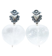 Aretes de poste conformado por corazón racimo y margarita, complementando con un cuarzo corazón transparente grande engarzado en la parte de abajo en cada uno.
