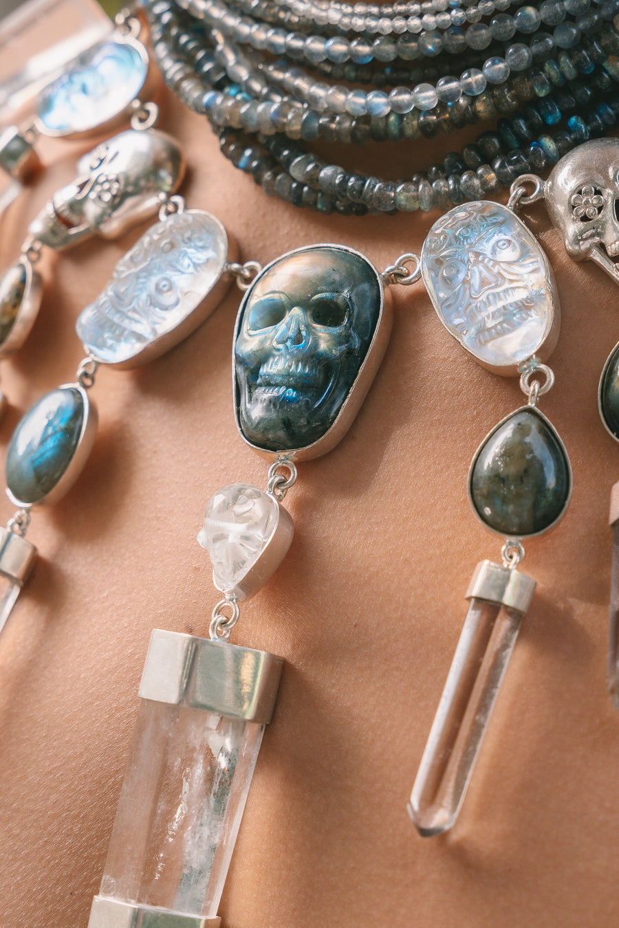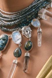 Collar edición especial formado por 13 hilos de labradoritas y algunas son facetados. Complementando con corazón de cuarzo tornasol, cinco cráneos de tornasol, cuatro cabuchones de labradorita, un cráneo de labradorita, nueve cuarzos facetados tubular irregulares, cráneo de cuarzo facetado, cabuchón de piedra luna y tres calavera lisa ojos flor.