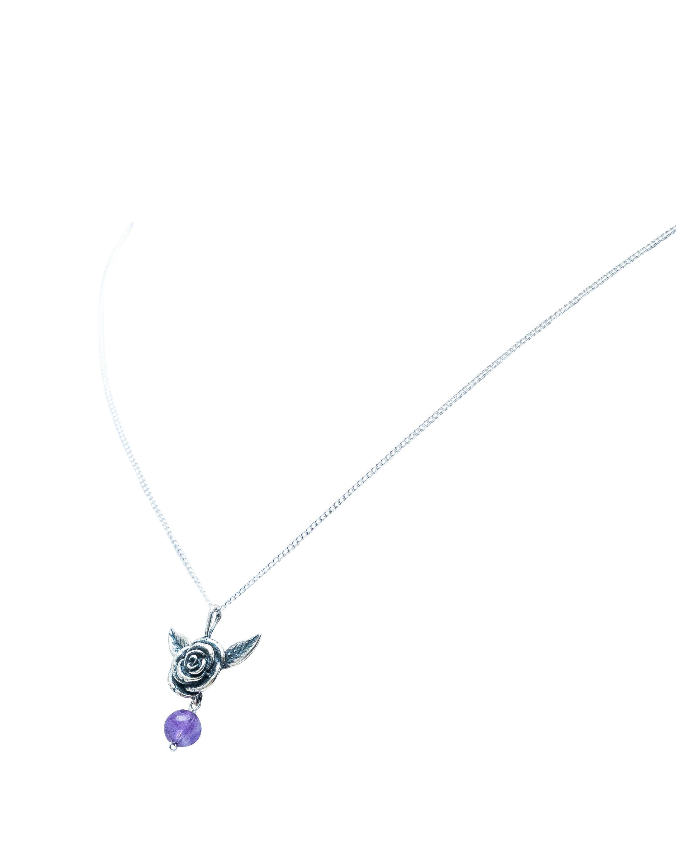 Entre pétalos y memoria, la rosa calavera florece junto a la amatista, guardando calma y profundidad.
