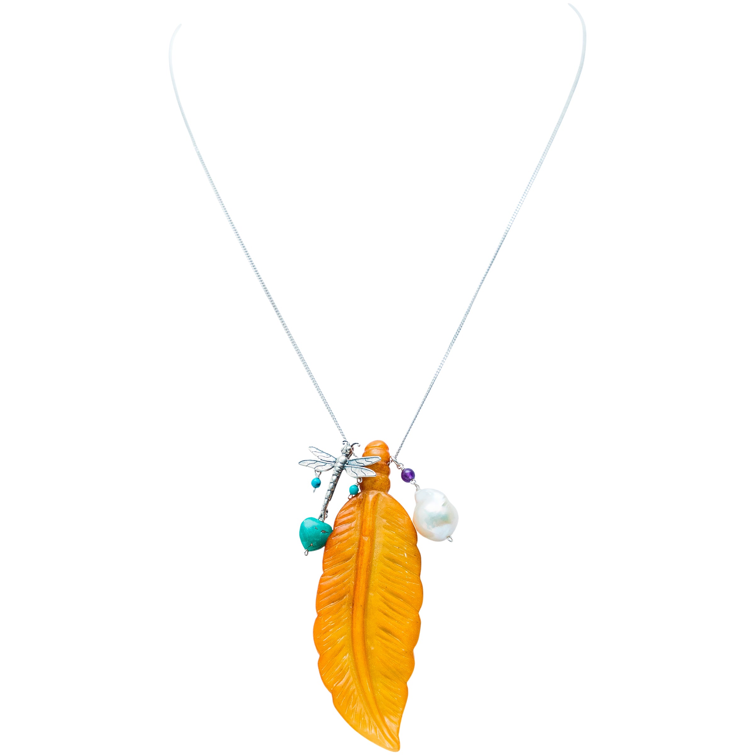 Cadena con dije de libélula hacienda con engarces de esferas pequeñas de turquesa y un corazón de turquesa, una pluma de cornalina, una perla barroca, una esfera mini de amatista engarzadas a la cadena.