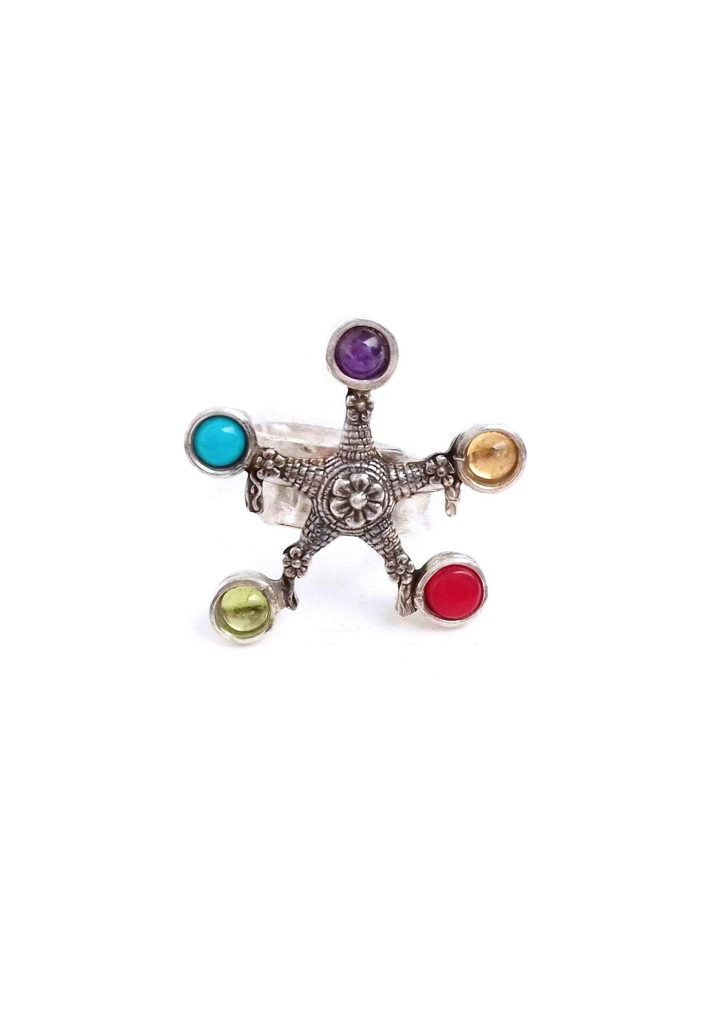 Anillo ajustable de piñata cinco picos con gemas naturales biseladas en cada pico: amatista, citrina, coral, peridot, turquesa.