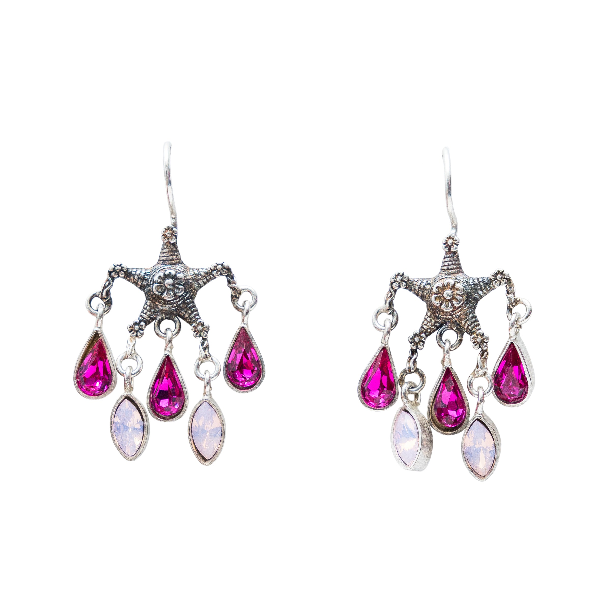 Arete edición especial de piñata de cinco picos chica de arillo con tres biseles de gota con Swarovski color bugambilia y dos biseles de hoja con Swarovski rosa