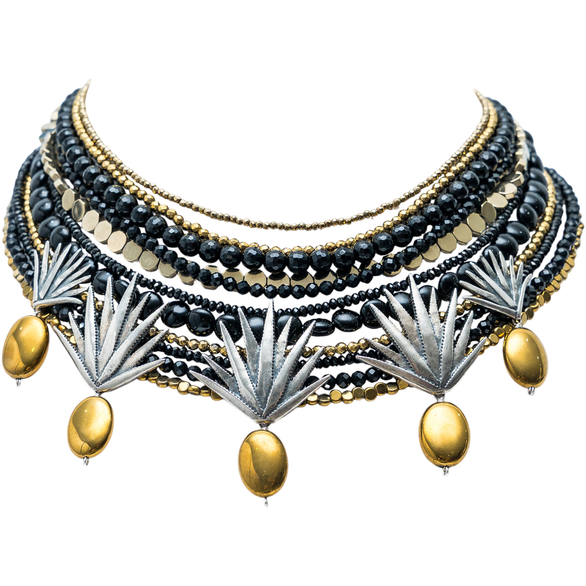 Espectacular collar de once hilos de ónix y hematita con cinco piezas de agaves de plata en dos diferentes tamaños