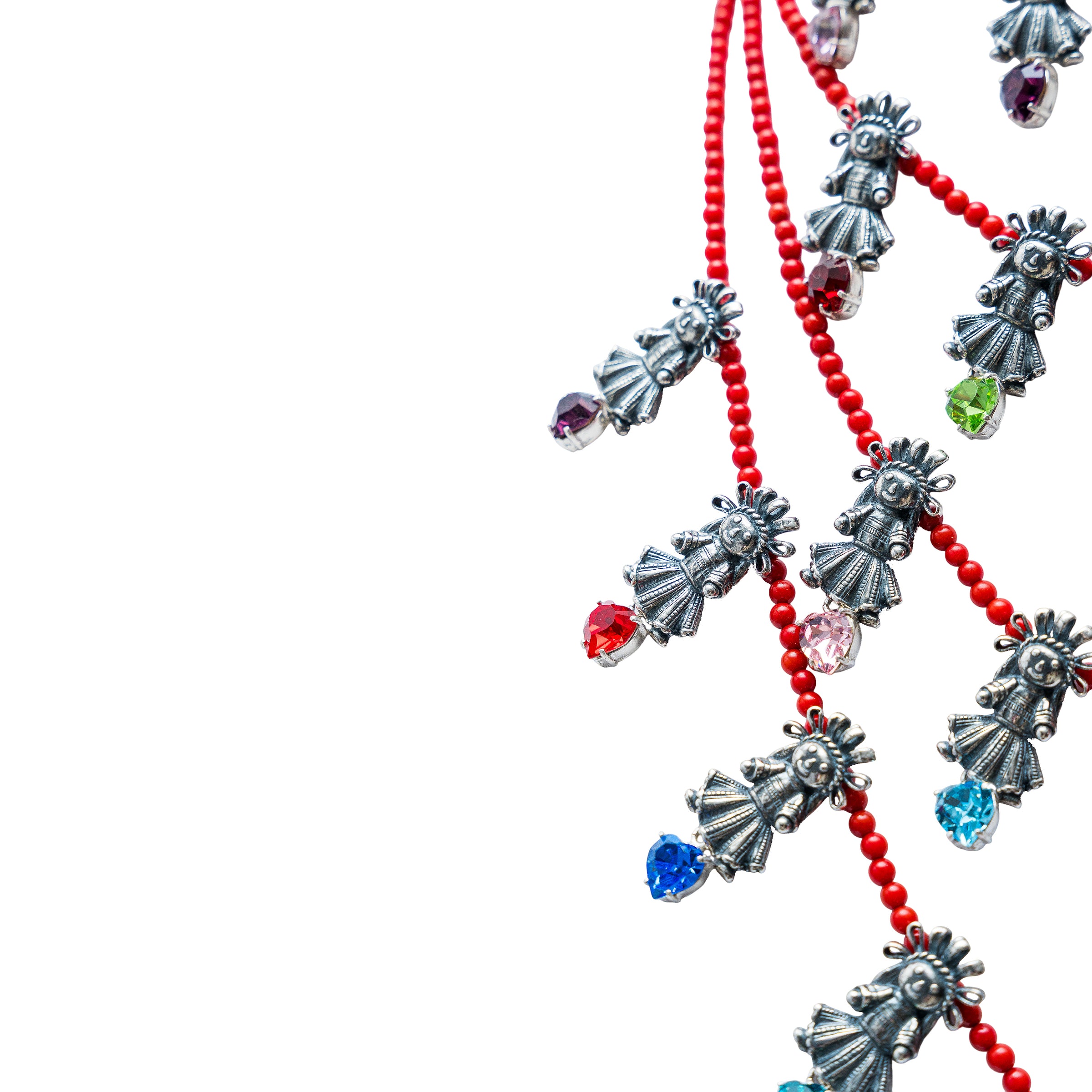 Cada muñeca en esta colección es un pequeño tesoro lleno de historia y color. Inspiradas en la tradicionales muñecas Leles, esta pieza vibrante celebra la alegría de la infancia y el arte de coleccionar. Con tonos vivos que evocan la magia de nuestras raíces, el collar invita a darle nombre a tu muñeca favorita, a acomodarla en un lugar especial y a guardar los recuerdos más queridos. Un homenaje al amor por lo hecho a mano y a esos momentos que permanecen en el corazón.