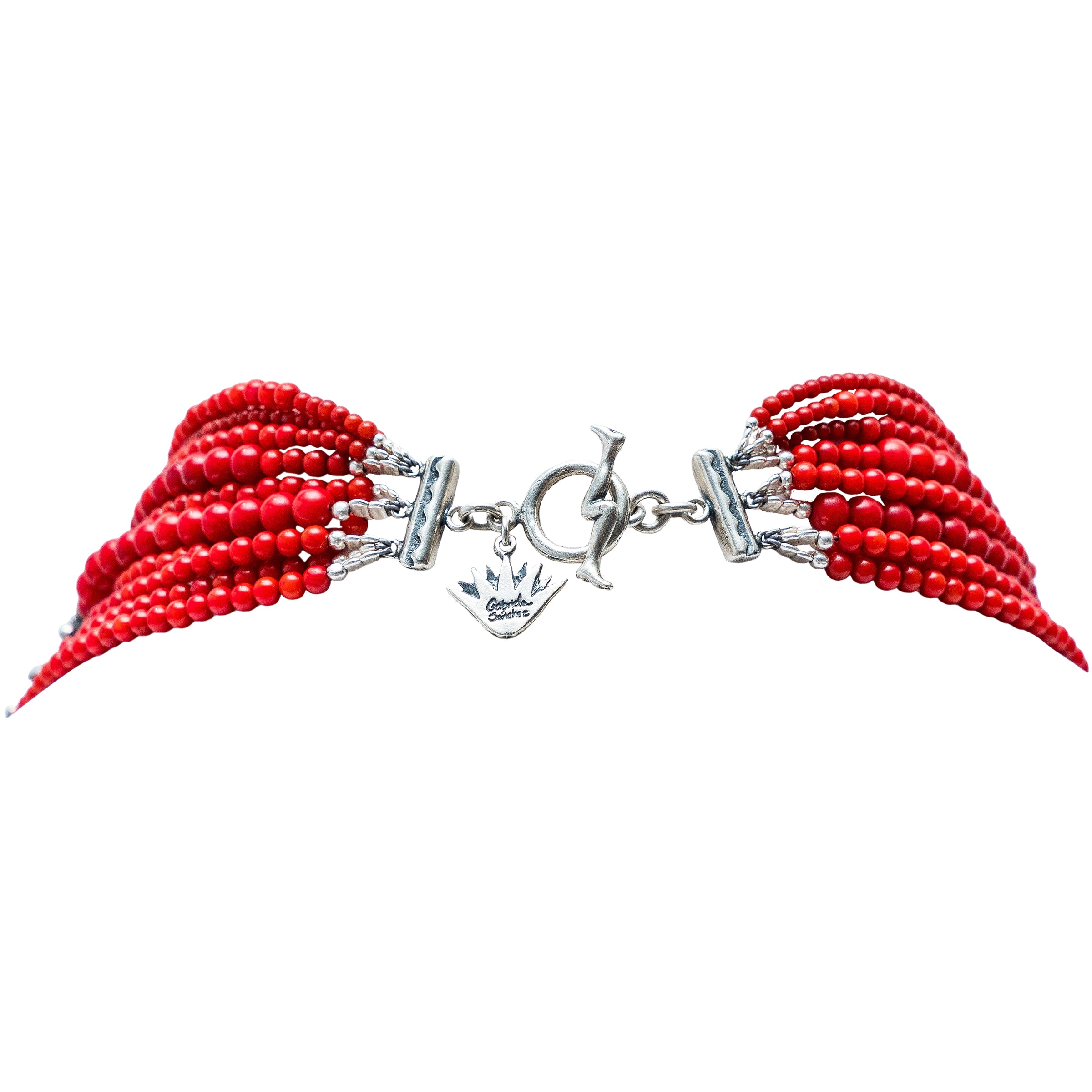 Espectacular collar edición especial de diez hilos de coral con 28 muñecas de listones medianas cada una adornada con corazones de cristal Swarovski en distintos colores.