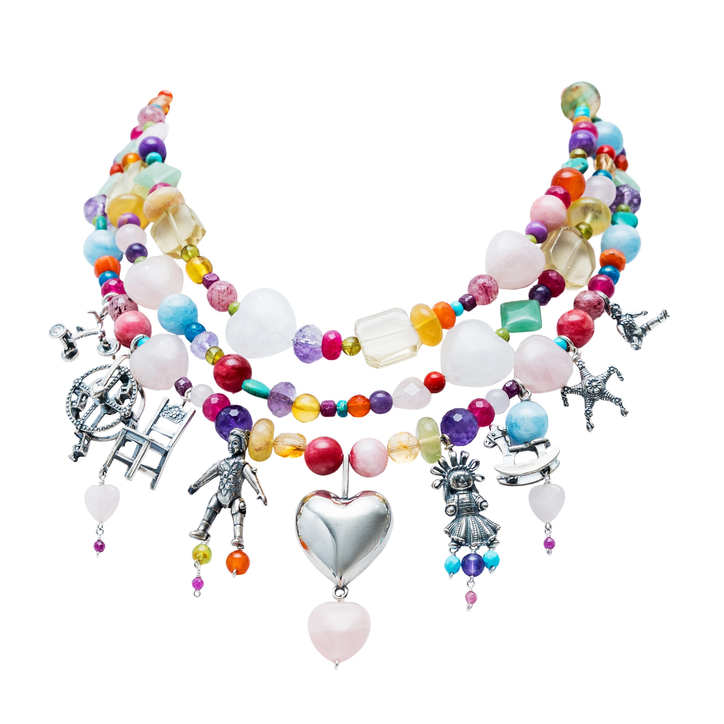 Collar de tres hilos en una delicada combinación de gemas naturales en tonos pastel con formas variadas en modo de confeti. Encontramos 9 dijes de plata: al centro un corazón, acompañado de una muñeca de cartón articulada, una muñeca de listones, una silla y un caballo balancín, una rueda de la fortuna y una piñata, también un triciclo una muñeca sentada.