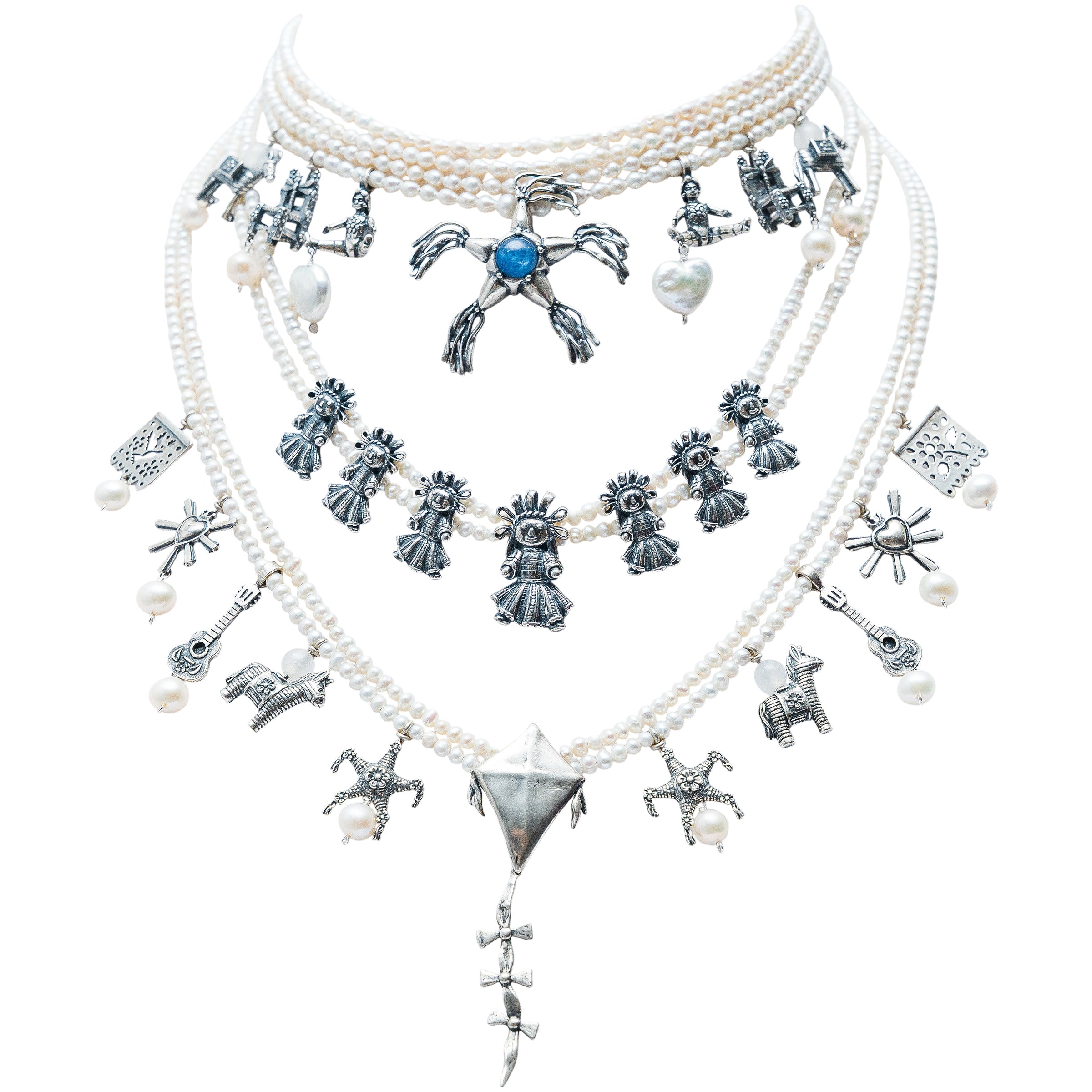 Espectacular collar de 8 hilos de perla en tres niveles con muñeca de listones mediana, papalote, piñata con bisel de cianita y 16 dijes juguetes varios con perlas colgando.