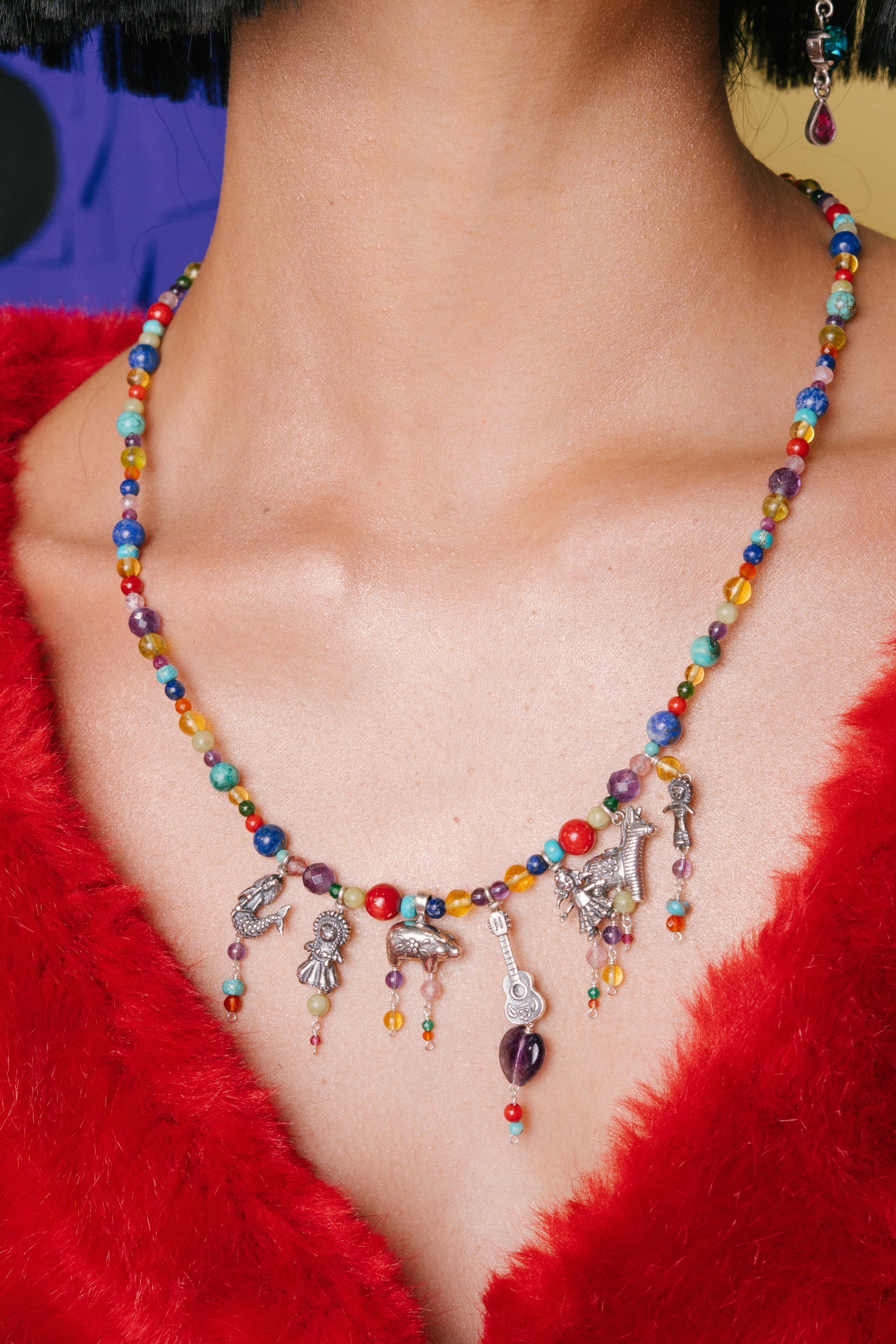 Piezas de plata: Sirena con flauta, muñeca mini, puerquito, guitarra, muñeca con colitas mini, piñata de burrito y muñeca de listones bebe. Gema: Amatista, ámbar, lapislázuli, turquesa, coral, jade, dioptasa y cuarzo fresa. Dije de guitarra engarzado con corazón de amatista, dijes con engarces de gemas coloridas.