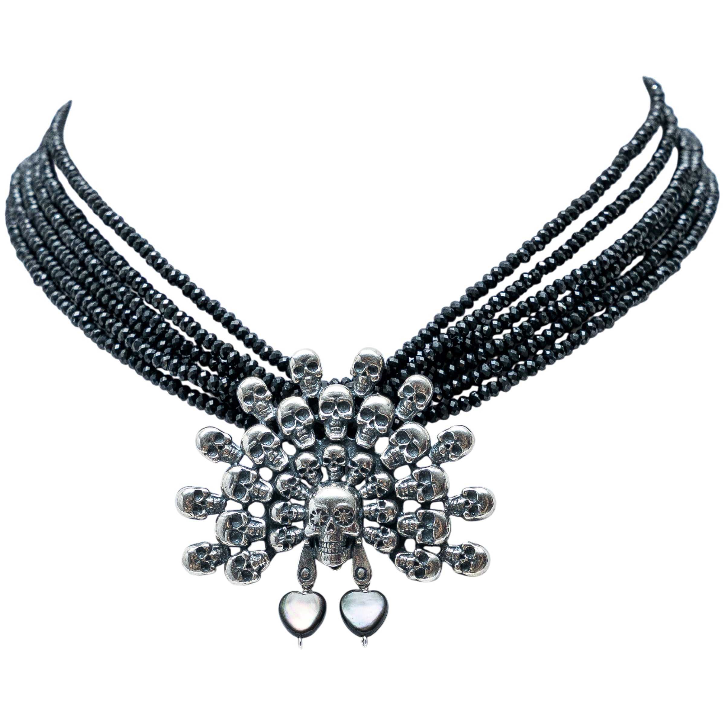 Gargantilla de seis hilos de spinel y un dije de Mictlantecuhtli con dos corazones de concha.