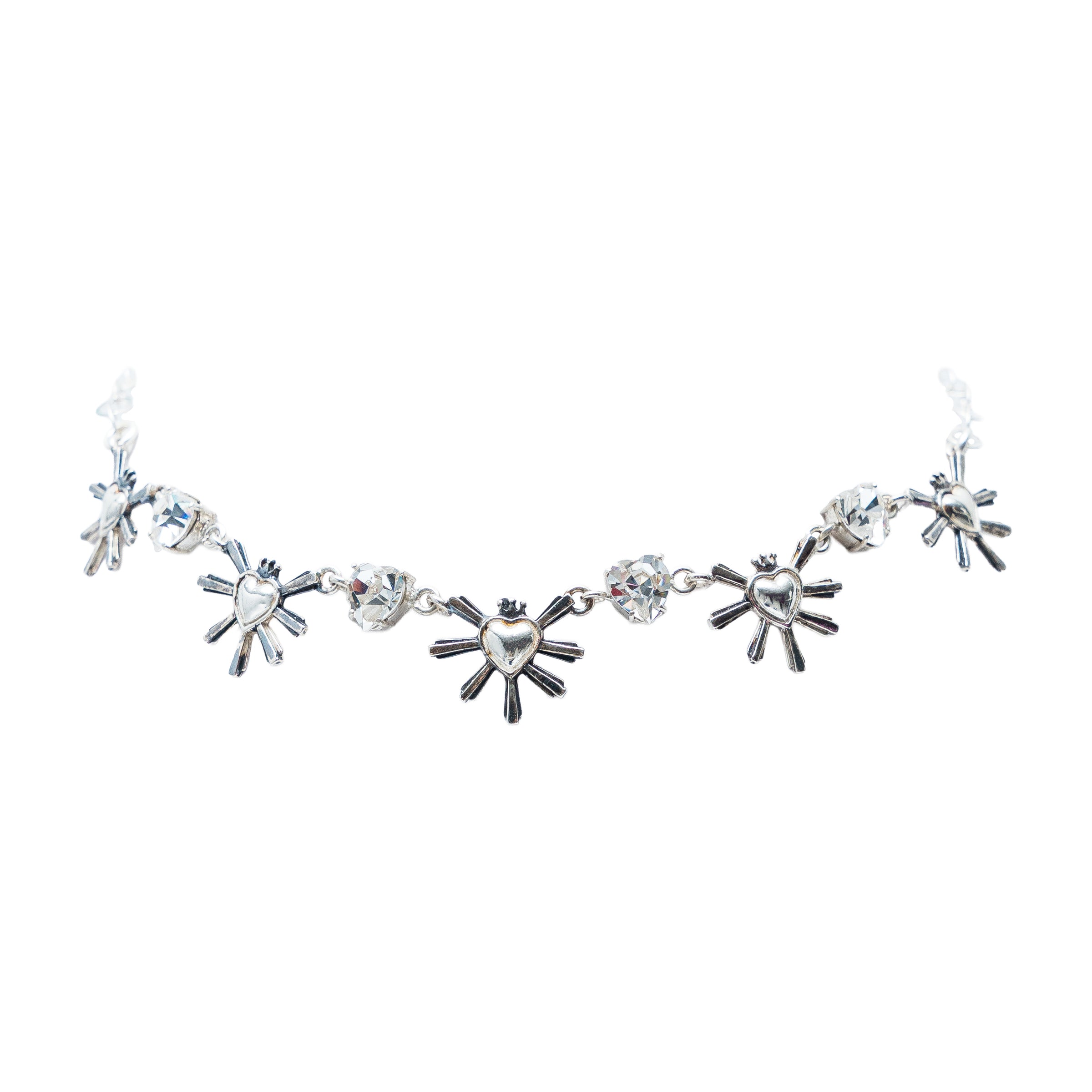 Gargantilla formada por cinco corazones de plata y cuatro corazones de Swarovski, con terminación en cadena y broche de perico.