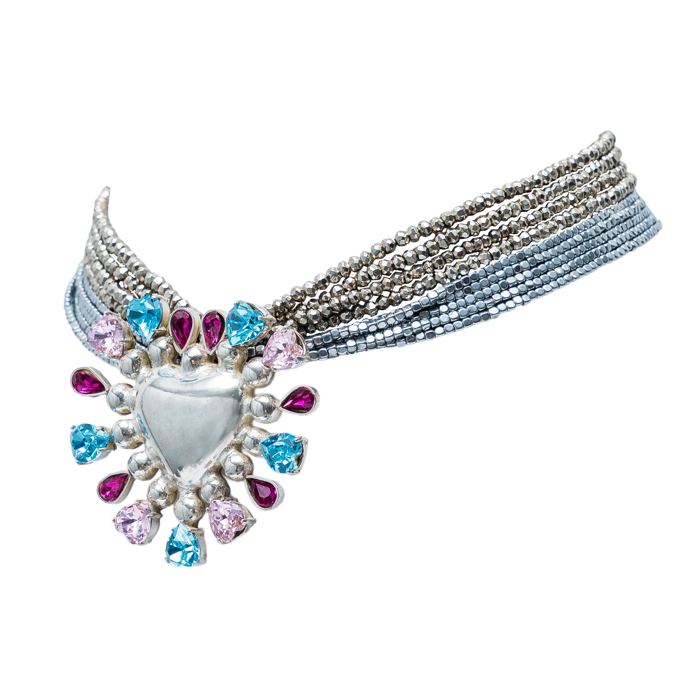 Nueve hilos de hematita plateada sostienen un corazón que tarde en destellos de bugambilia, rosa y azul cielo. Cada cristal brilla como un suspiro de emoción, y cada punto de plata borda ternura y sofisticación. Una gargantilla que combina delicadeza y magia, para llevar el amor y la luz cerca del corazón.