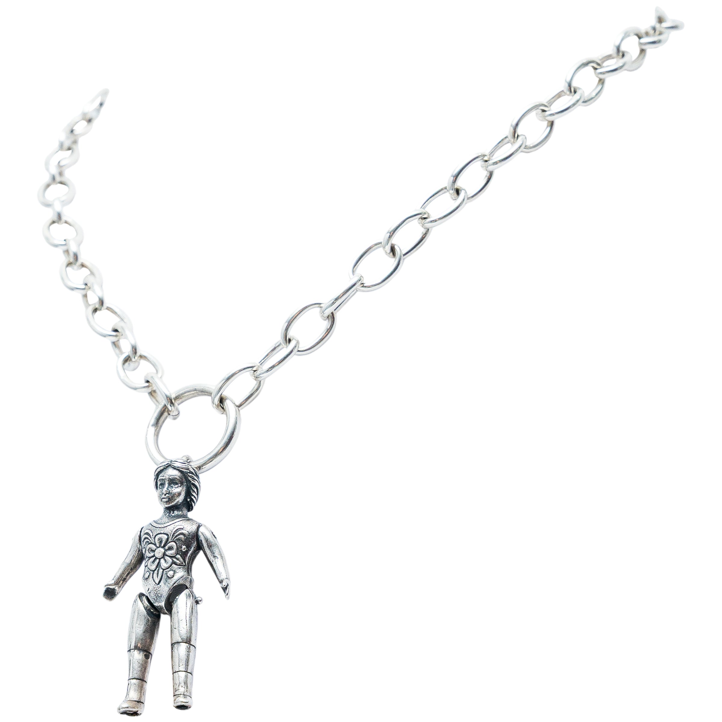 Collar de cadena ovalada chica con dije de muñeca de cartón movible