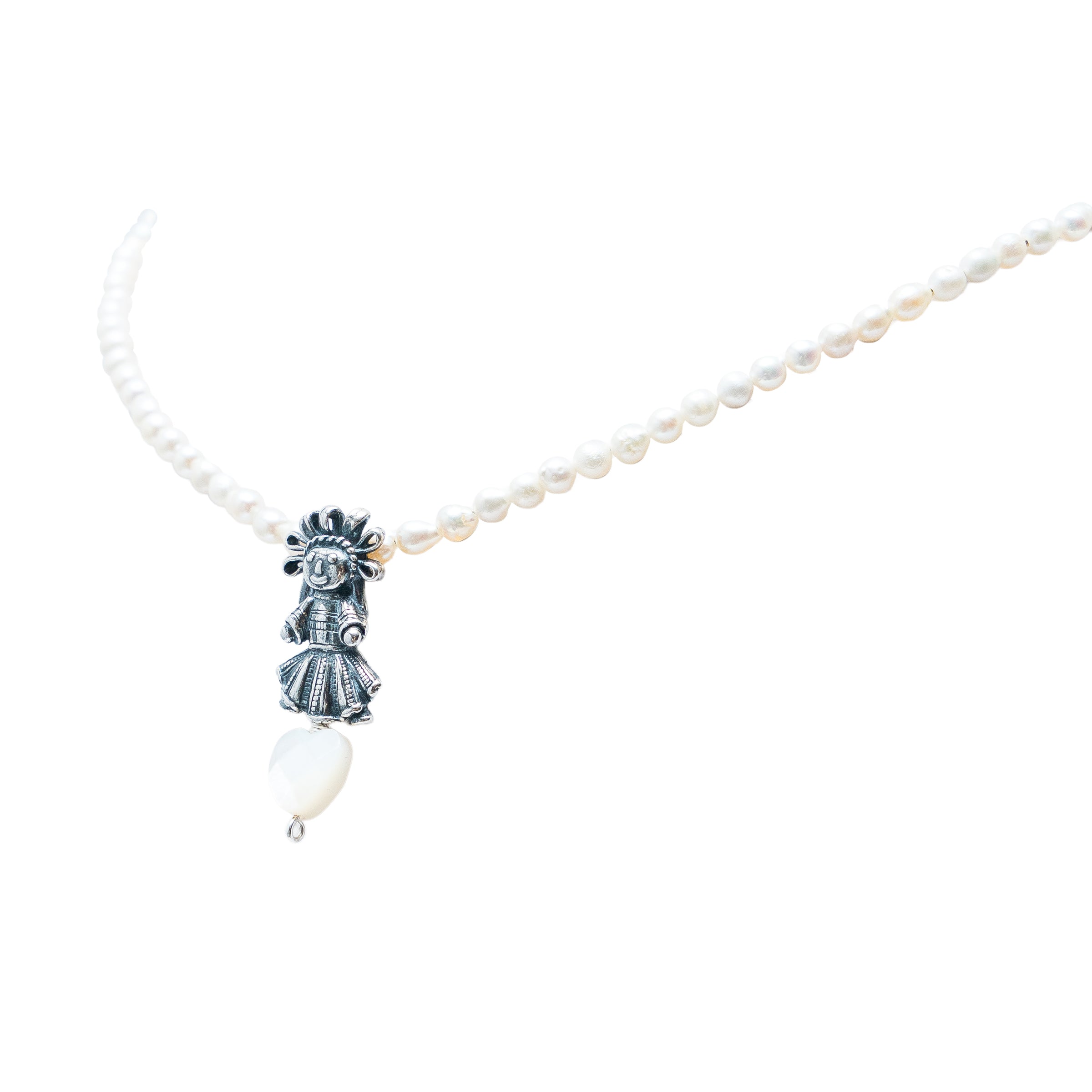 Sobre un hilo de perlas descansa una muñequita de listones, pequeña y brillante, que sostiene un corazón de concha facetada. Un amuleto suave y luminoso, como un gesto tierno guardado cerca del alma.