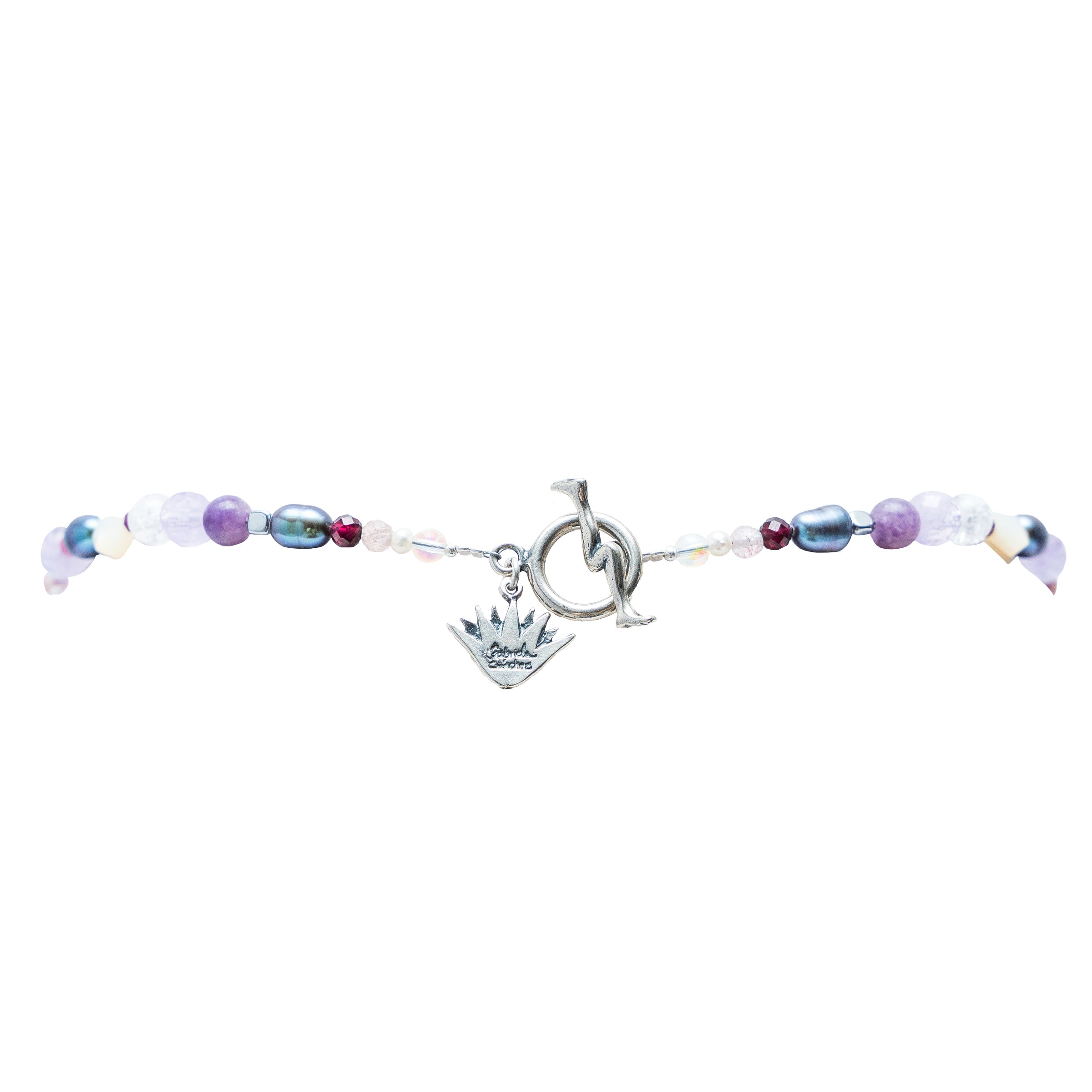 Collar tipo gargantilla de un hilo de gemas naturales de cuarzo, amatista, turmalina, rubí , perla de abulón con 1 muñeca de listones chica y un corazón de concha.