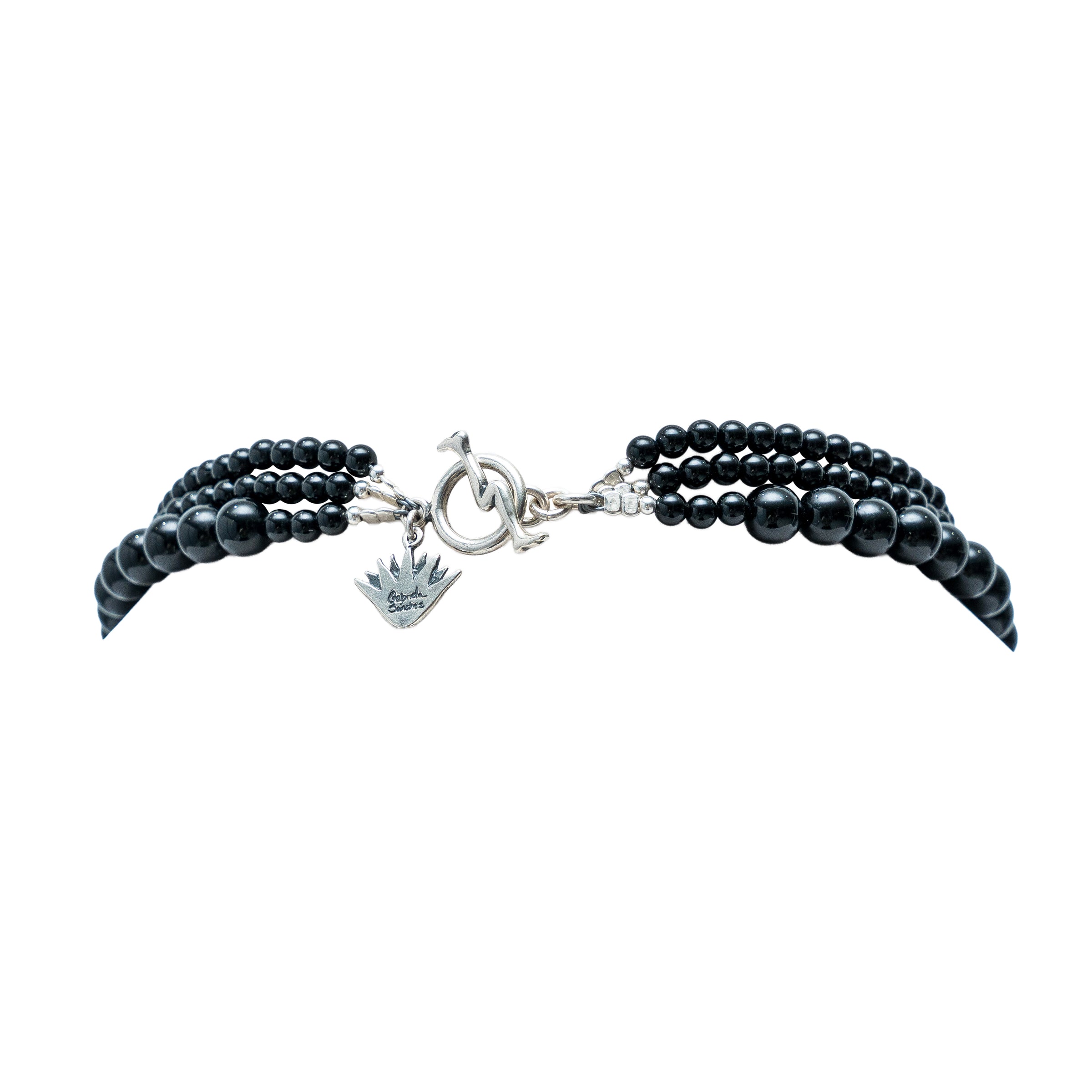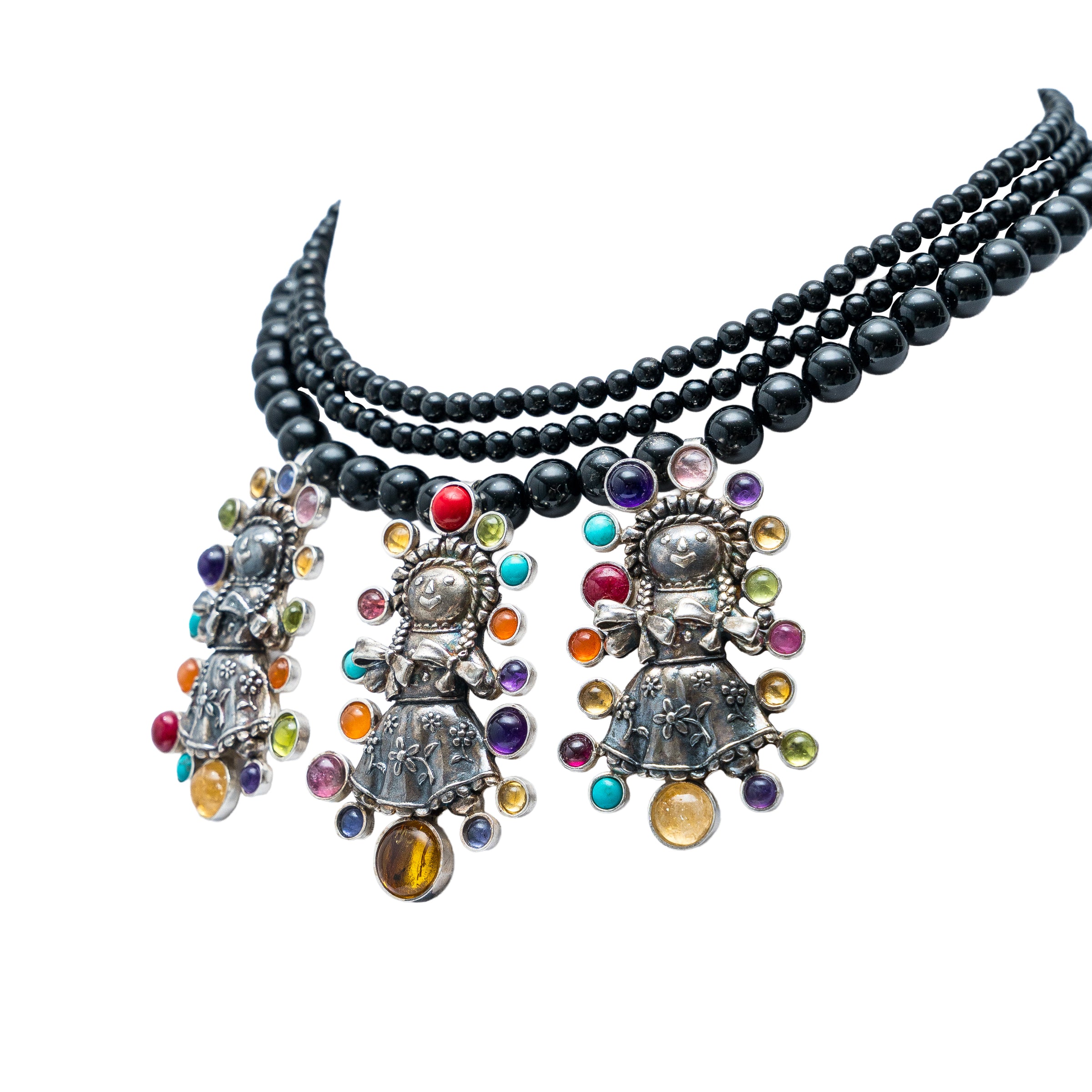 Collar tipo gargantilla de tres hilos ónix facetado con 3 dijes de muñecas de listones grandes adornadas con biseles de gemas naturales: turquesa, citrina, rubí, peridot, cornalina, coral, amatista, granate, ámbar, turamalina rosa.