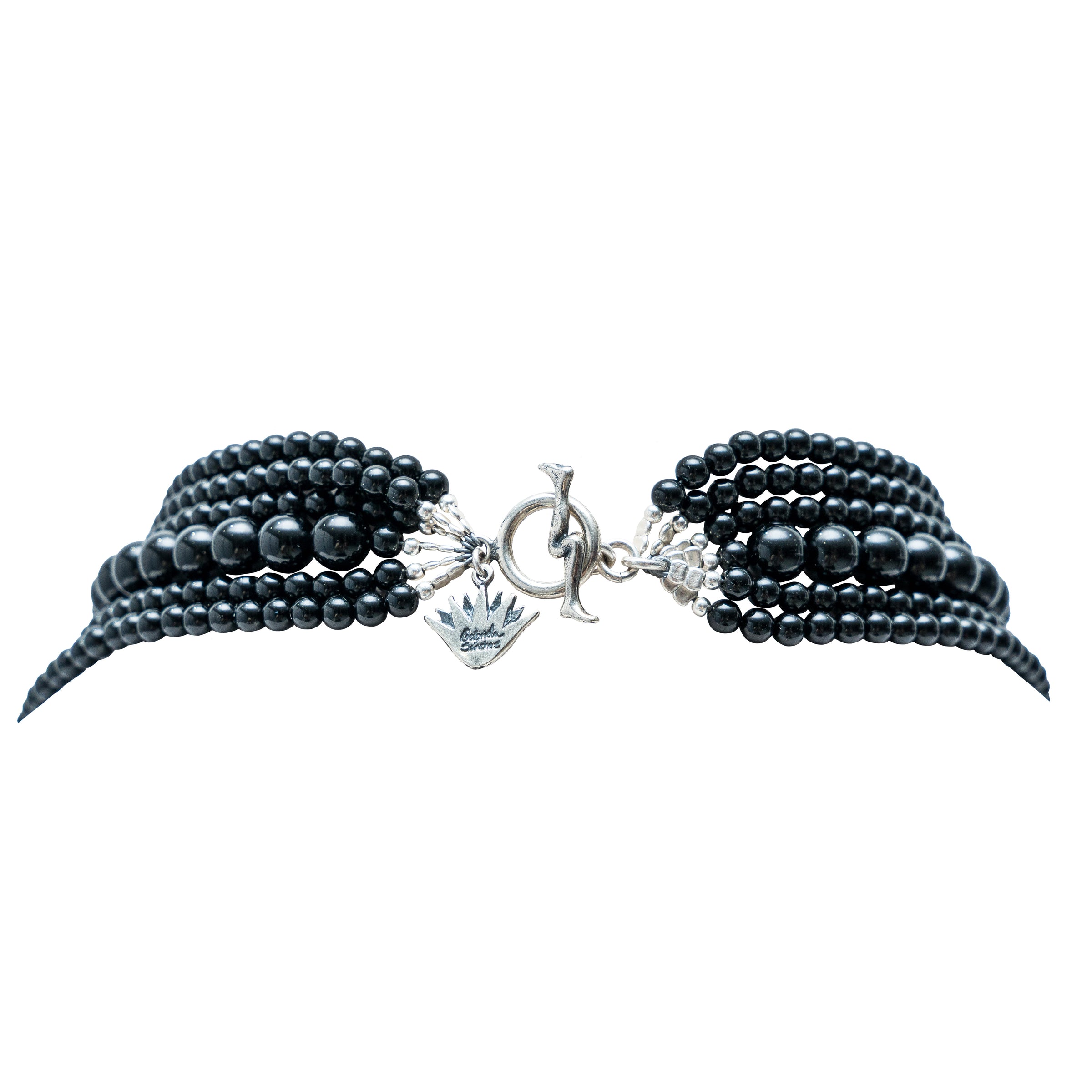 Espectacular collar de once hilos de ónix y hematita con cinco piezas de agaves de plata en dos diferentes tamaños