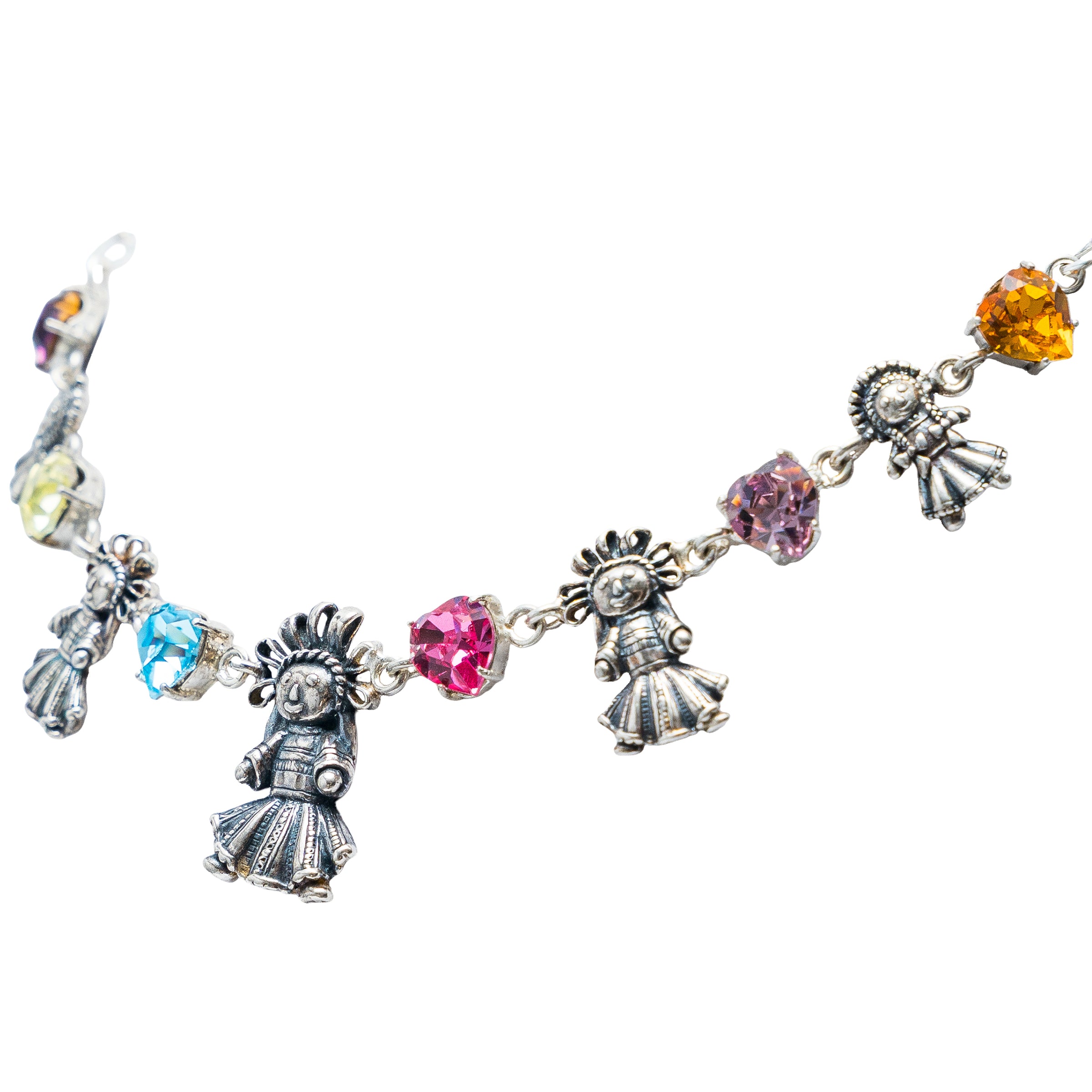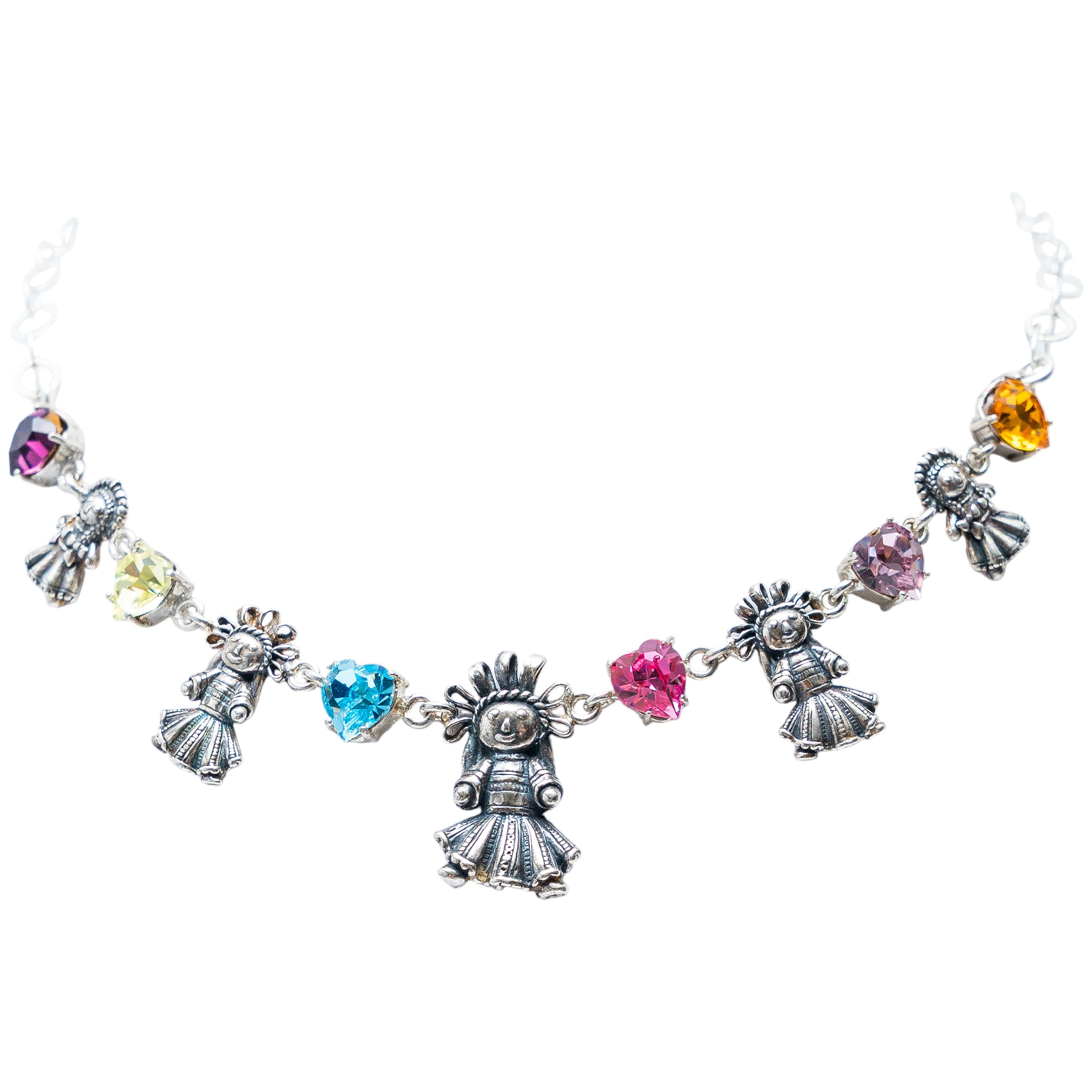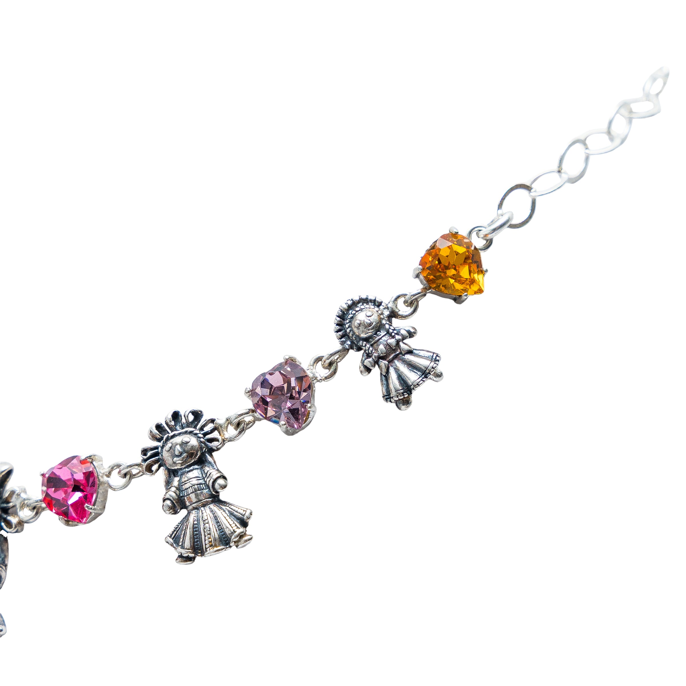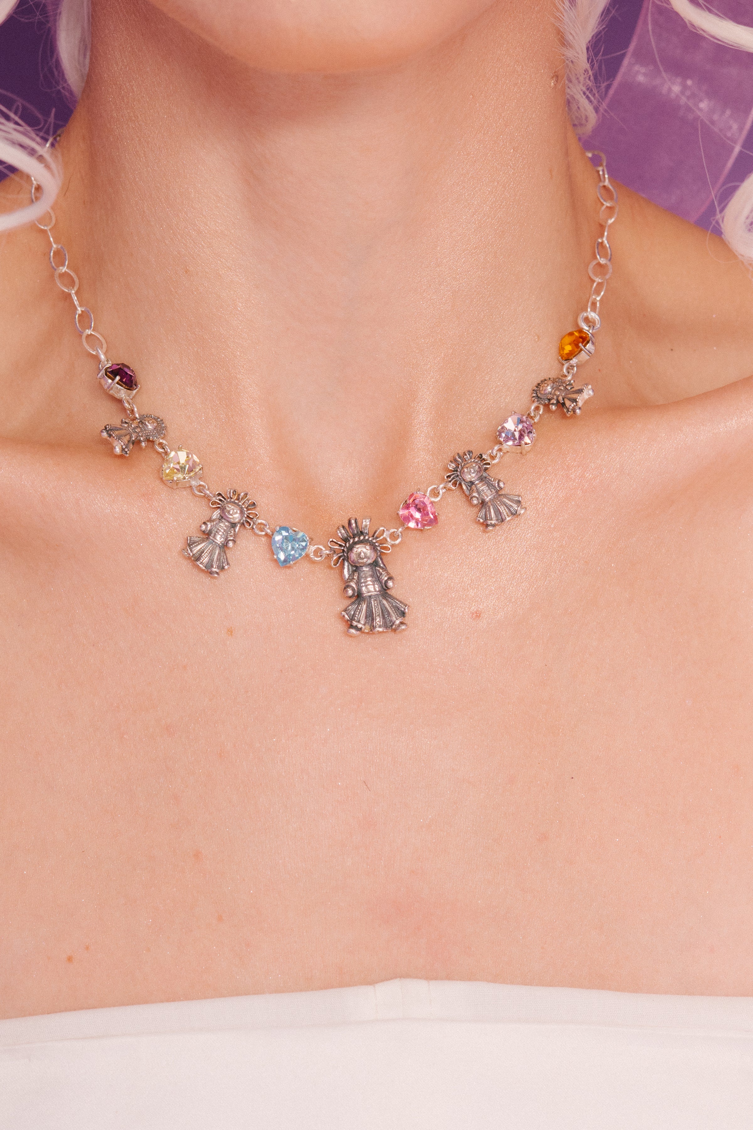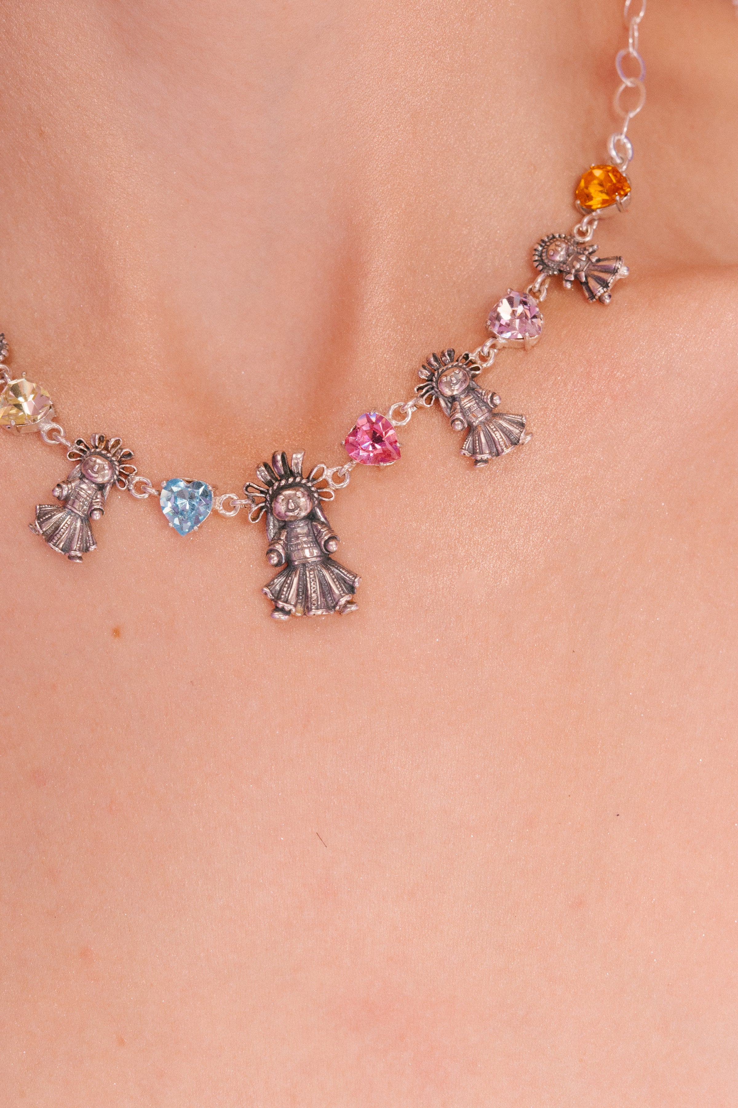 Un collar que celebra la alegría de la vida y la tradición mexicana. Cristales brillantes adornan a las pequeñas muñecas Lele, tradicionales de Querétaro, como un desfile de figuras que bailan al ritmo de los villancicos.