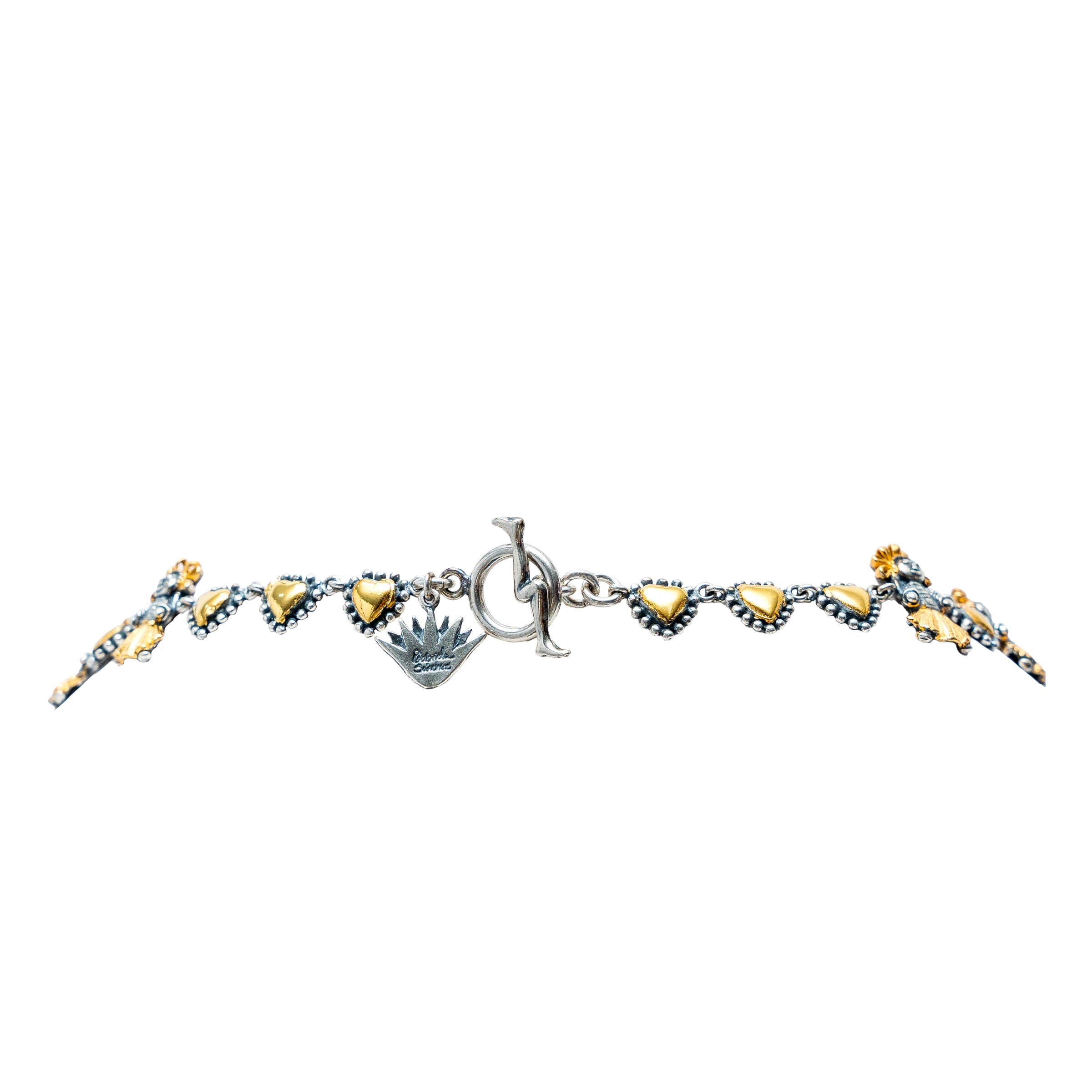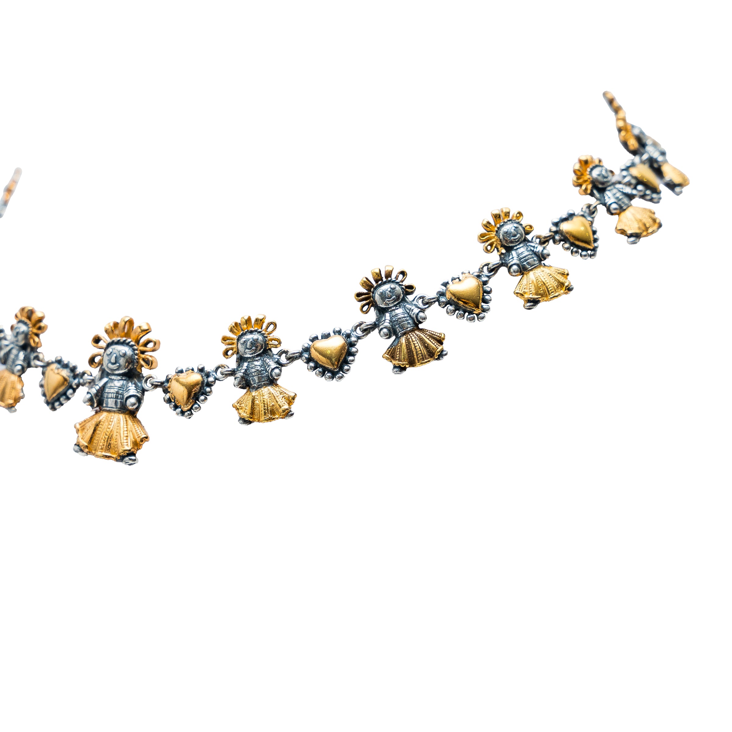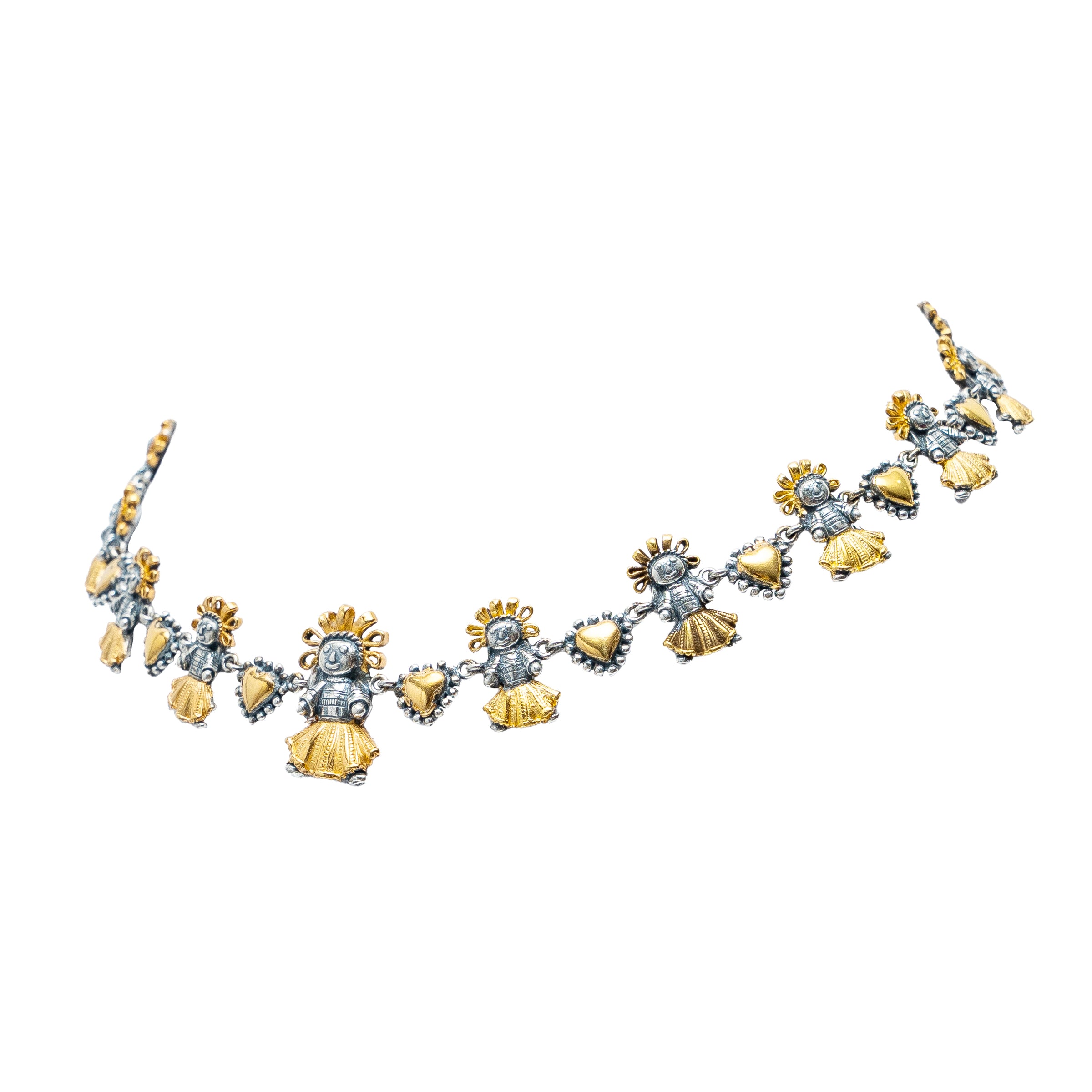 Gargantilla edición especial de aniversario conformada de Muñecas de listón mediana y muñecas chicas y corazones con puntos con detalles en baño de oro 24k.