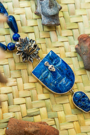 Collar largo edición especial formado por gotas de sodalita, complementado con un dije de Kukulcán mediana, rostro de sodalita, con decoración de tótem, cráneo de lapislázuli y una gota de lapislázuli biselado.