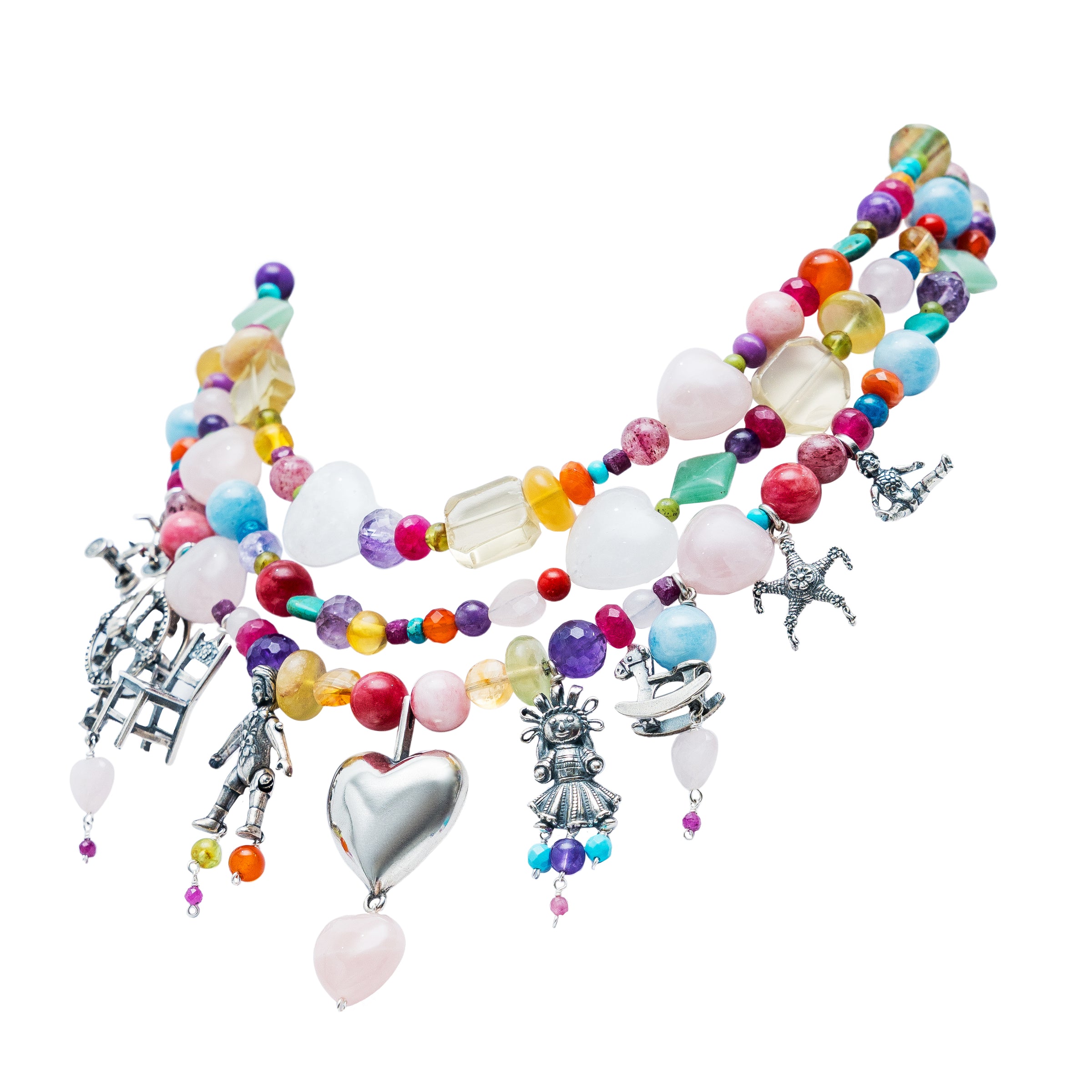 Collar de tres hilos en una delicada combinación de gemas naturales en tonos pastel con formas variadas en modo de confeti. Encontramos 9 dijes de plata: al centro un corazón, acompañado de una muñeca de cartón articulada, una muñeca de listones, una silla y un caballo balancín, una rueda de la fortuna y una piñata, también un triciclo una muñeca sentada.