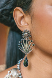 Aretes de edición especial de poste conformado por un Dios Mictlán chico, un agave realista, seis cabuchones de ónix y una gota de ónix biselados en cada uno.