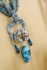 Collar edición especial formado por seis hilos de labradorita irregular, complementando con un dije de cráneo de labradorita, dos gotas de ónix biselados, serpiente emplumada, labradorita biselado y Kukulcán mediana.