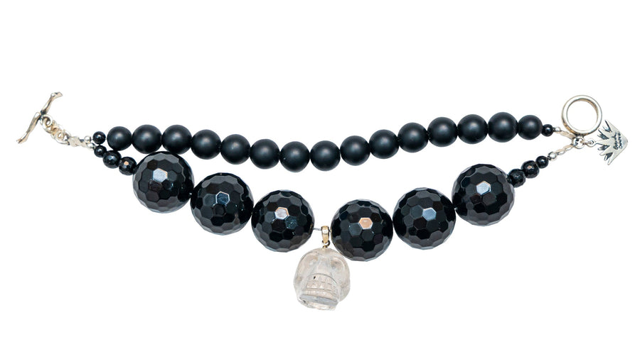 Pulsera formada por dos hilos uno de ónix facetado grande y obsidiana mate, complementando cráneo tallado en cuarzo.