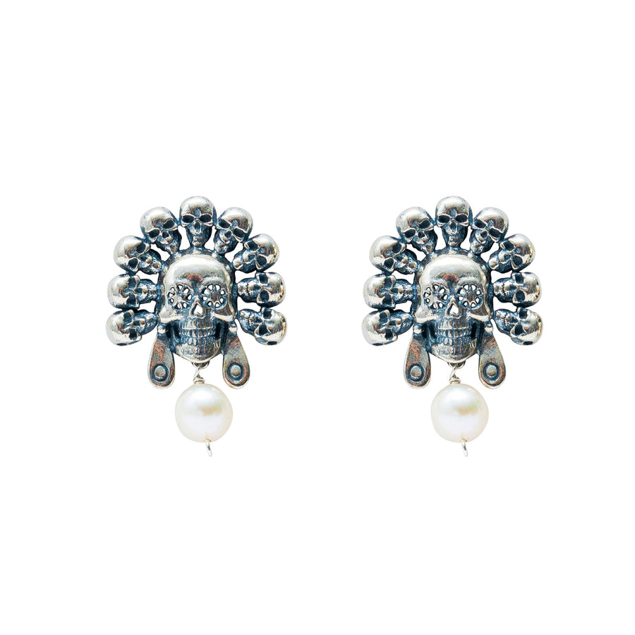 Aretes de arillo conformado por Dios Mictlán chico y una perla engarzada en la parte de abajo en cada uno.