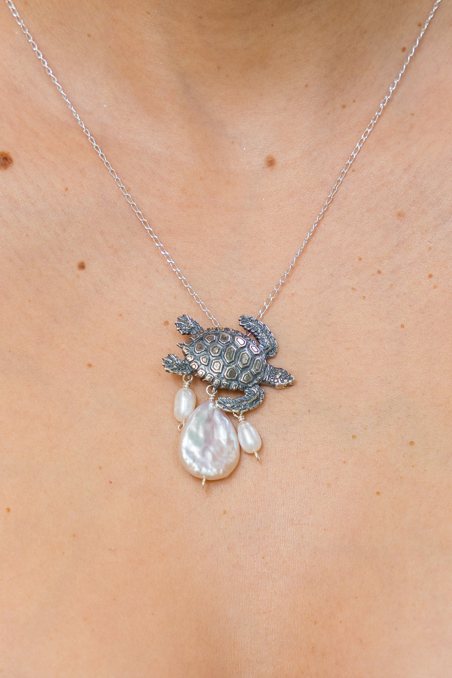 Cadena con dije de tortuga cahuama, complementando con 2 perlas ovaladas y una gota de perla irregular engarzadas en la parte de abajo.