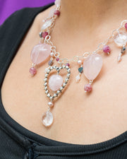 Collar edición especial formado por eslabones de plata con un dije central de guía de corazones con gemas naturales engarzadas como: 2 corazones cuarzo rosa grandes, un corazón cuarzo rosa mediano, 2 corazones de cuarzo rosa chico, 3 cuarzo blanco facetado circular, 4 corazones hematita plateado, perla con tonalidad rosa, cuarzo fresa facetado y esferas de cuarzo rosa.