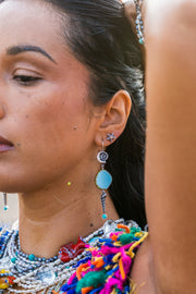 Aretes de arillo conformado por caracol grueso, circulo irregular azul de resina, caracol tornillo mediano y un cabuchón de turquesa biselado en cada uno.