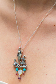 Cadena con dije de mamá y niños complementado con gemas naturales engarzadas como: ámbar, corazón de concha, turquesa facetado, rubí mini y amatista en la parte de abajo.