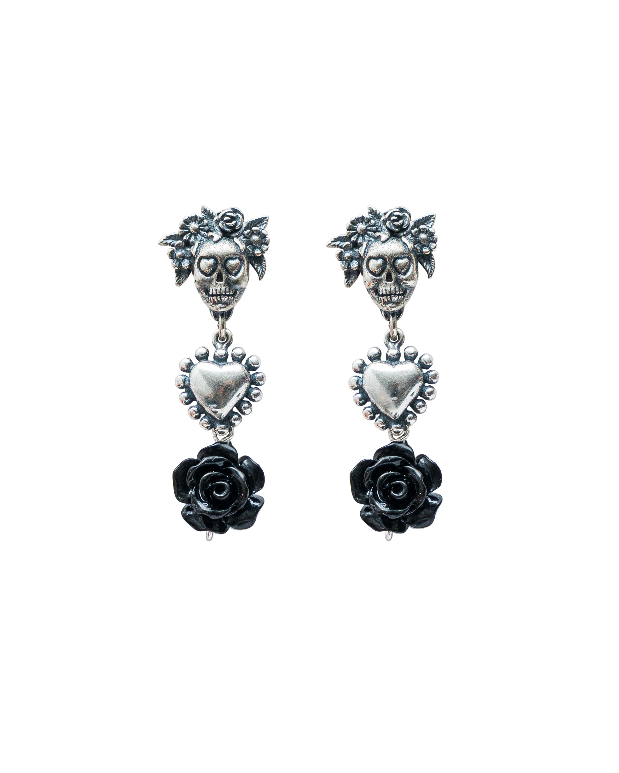 Aretes de poste conformados por una cabeza calaca Frida, un corazón con puntos chico y engarces de rosa negra de resina.