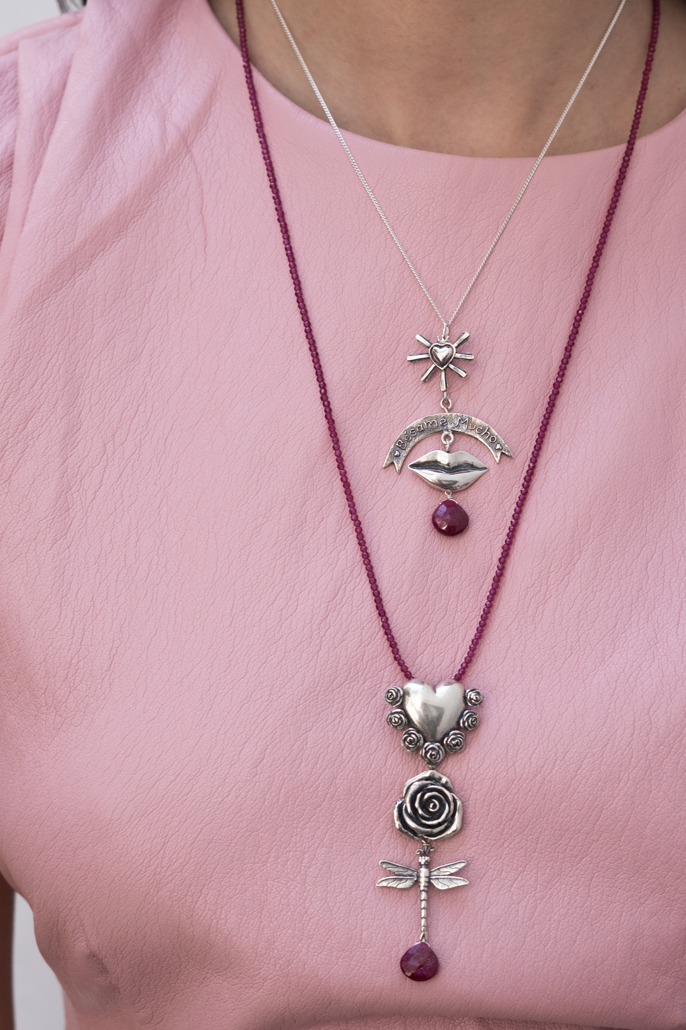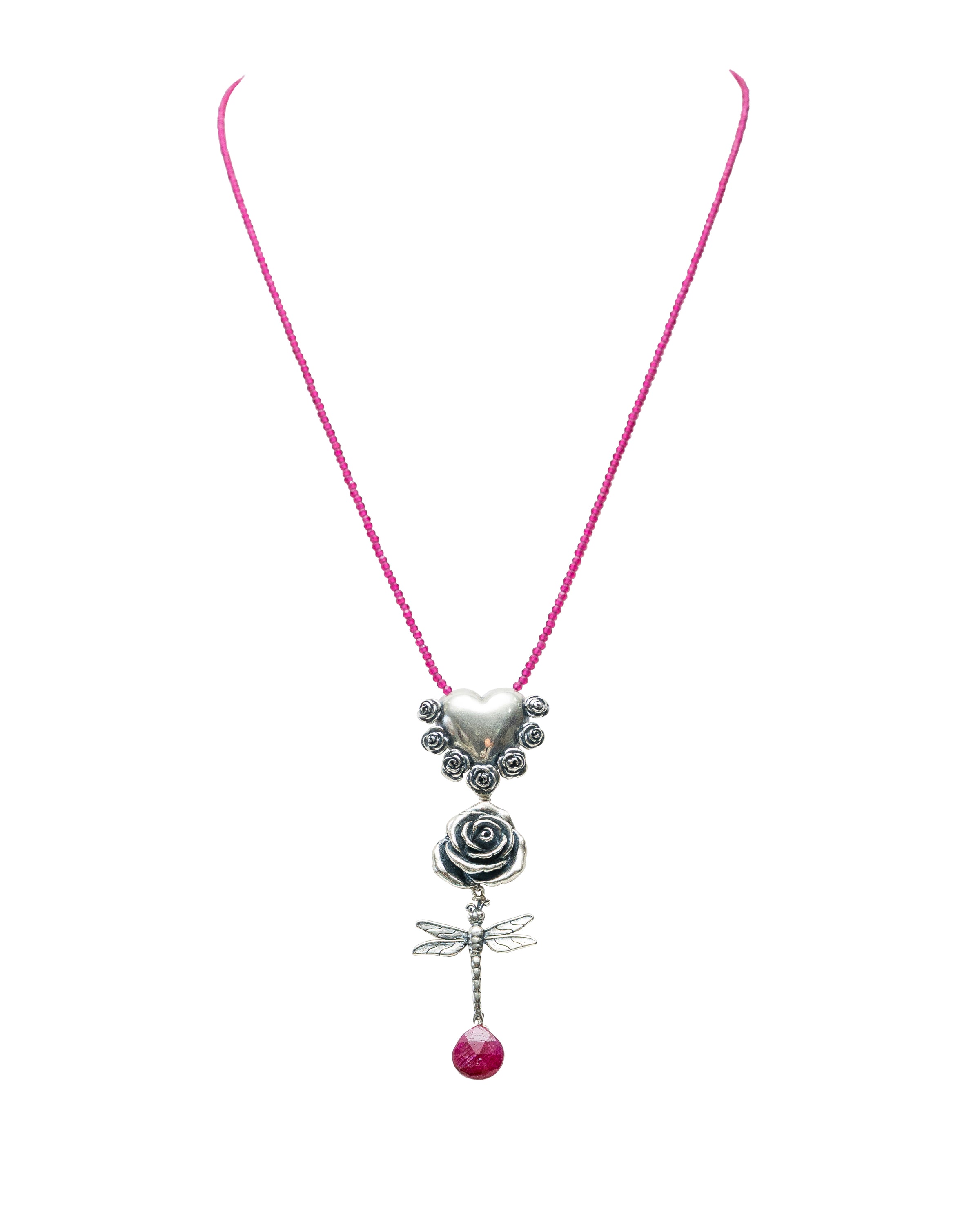 Collar de rubí facetado con corazón con rosas chico, rosa mediana y libélula con gota de rubí colgando.