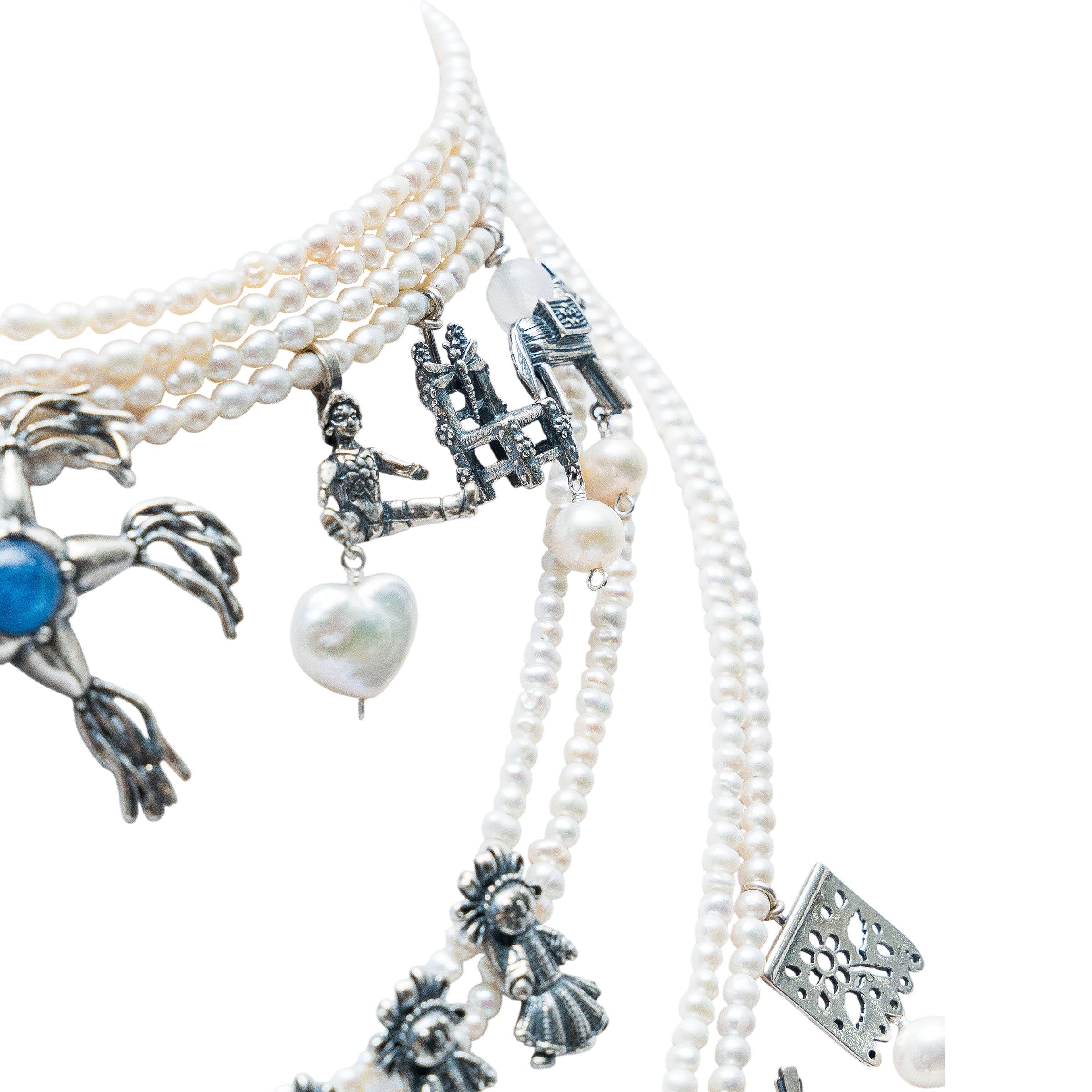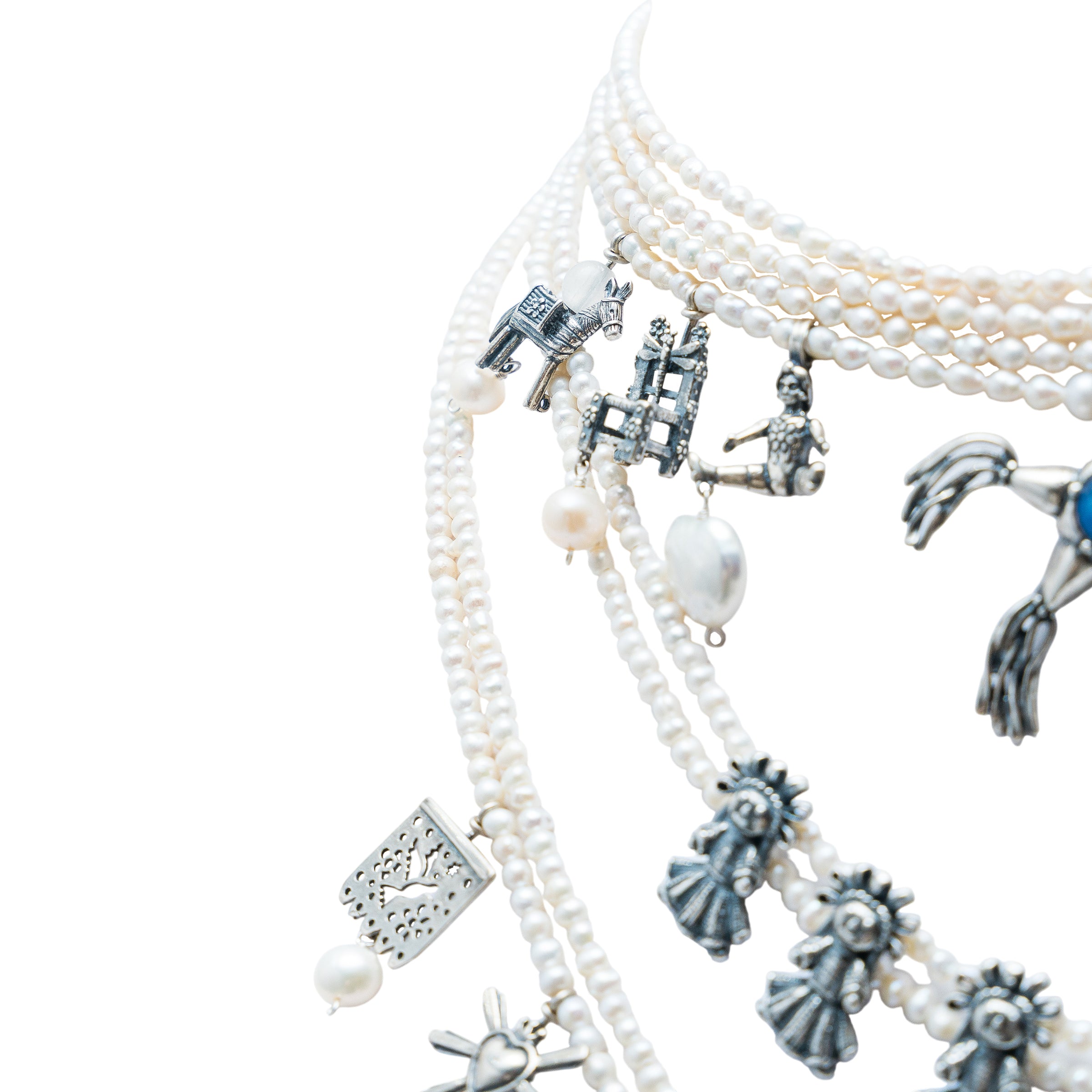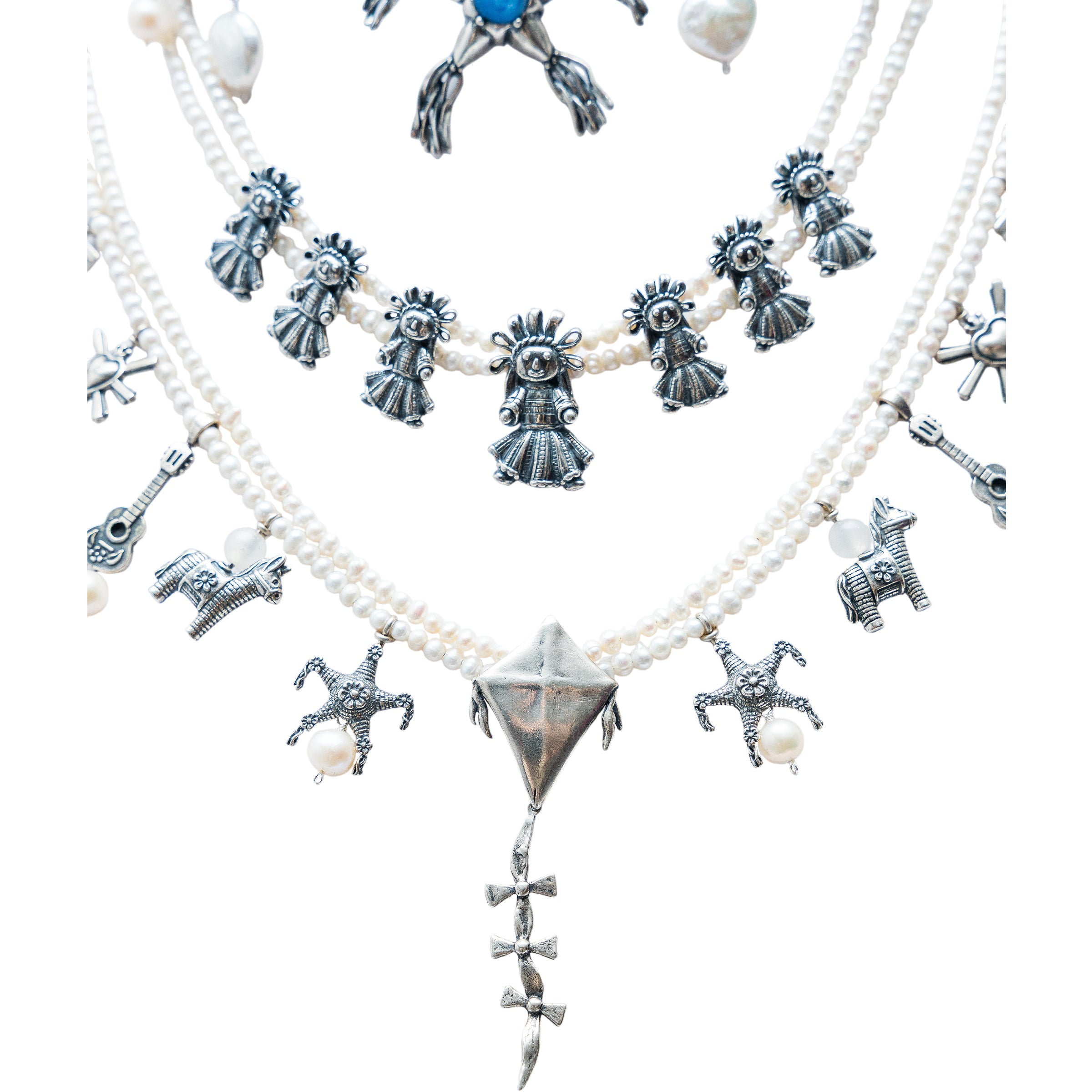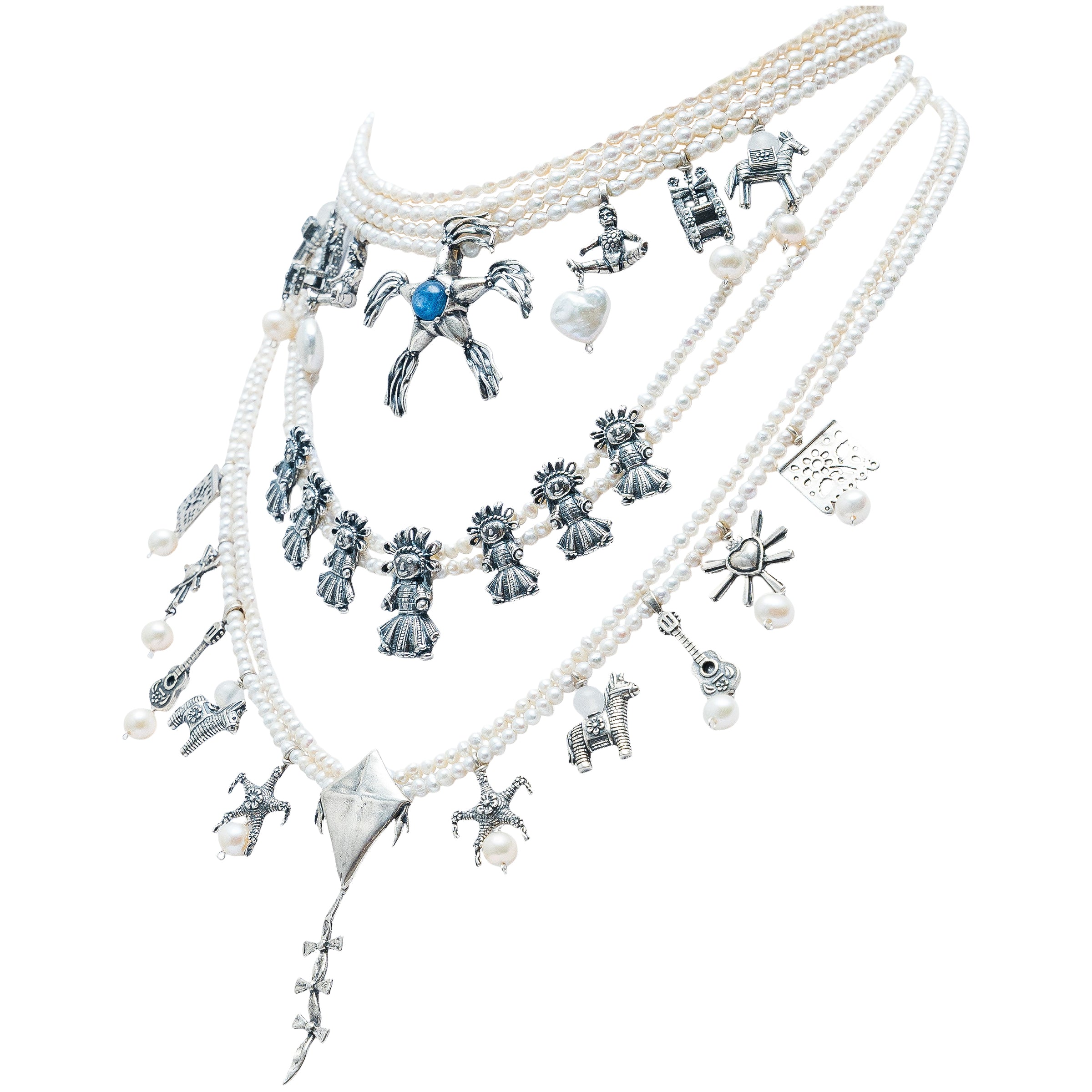 Espectacular collar de 8 hilos de perla en tres niveles con muñeca de listones mediana, papalote, piñata con bisel de cianita y 16 dijes juguetes varios con perlas colgando.