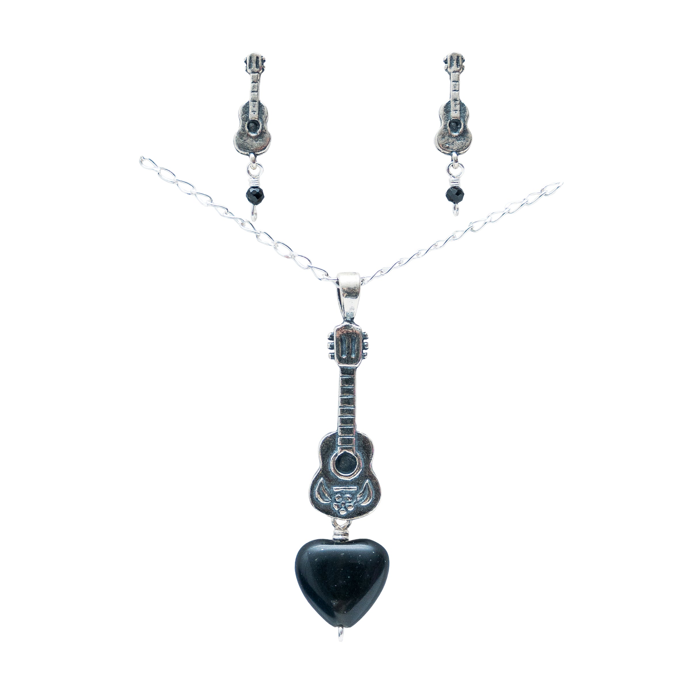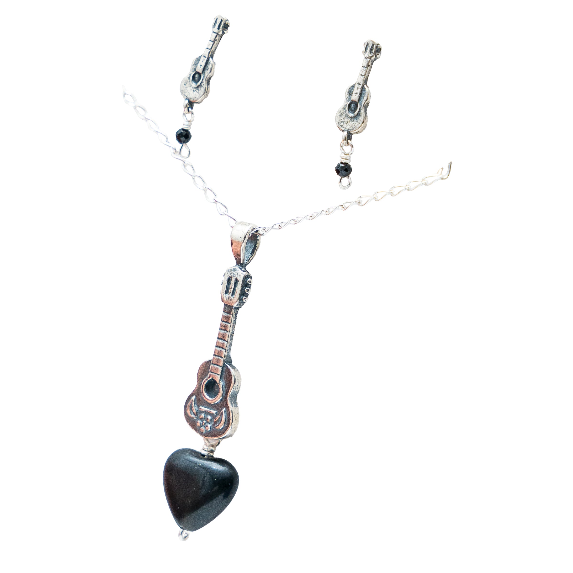 Aretes de poste guitarra mini con ónix engarzada y Dije de Guitarra con corazón de ónix engarzado.