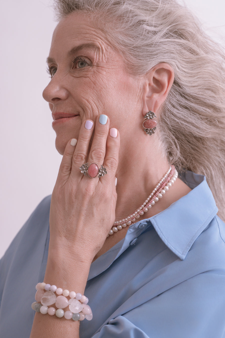 Anillo ajustable con dos flores cerezo y en medio un cabuchón ovalado de rodocrosita biselado.