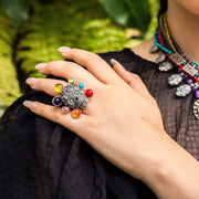 Anillo de calavera ojos flor mediana con 6 biseles de gemas naturales de amatista, rubí, turquesa, peridot, cornalina y ámbar.