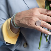 Anillo ajustable conformado por un cabuchón de cuarzo rosa circular biselado.