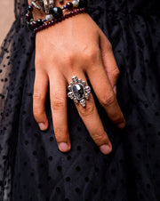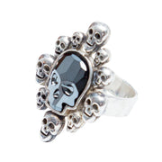 Anillo ajustable, conformado por diez cráneos de tótem acompañado de un Swarovski gris al de cráneo en el centro.