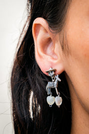 Aretes de poste con cabecita de Diego, con una mulita y un corazón de concha facetado.