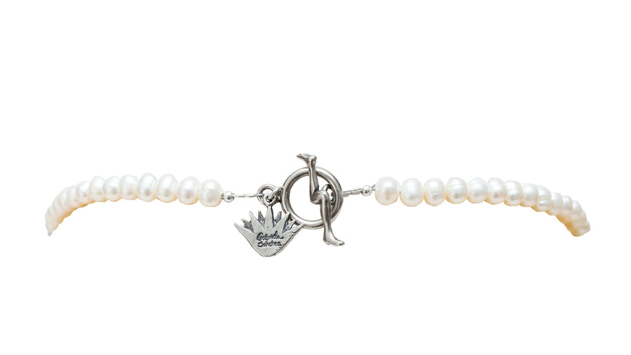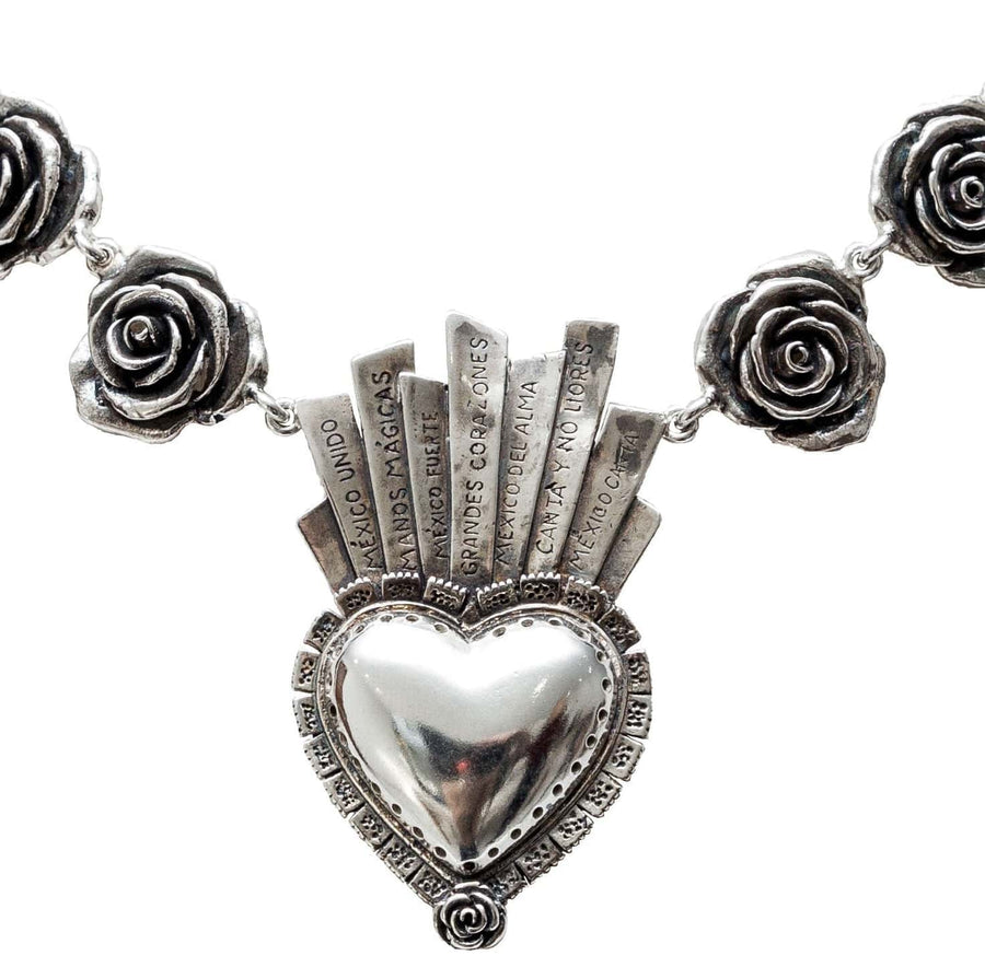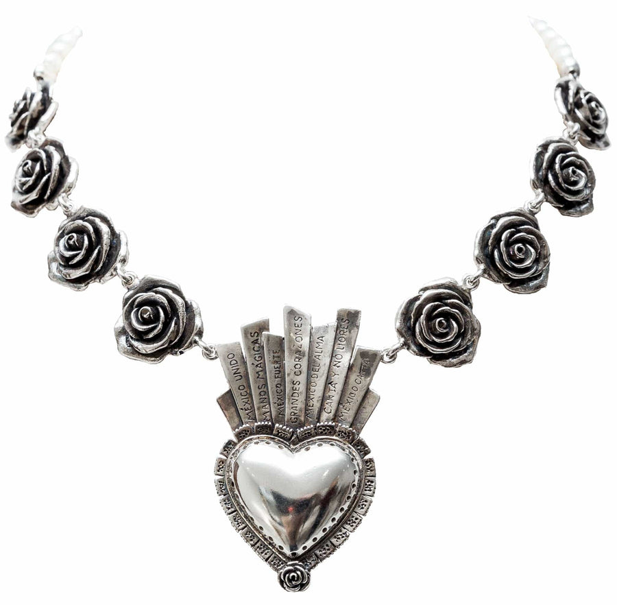 Collar formado de rosas con un corazón con mensajes en el centro y en los bordes del collar encontraremos esferas de perlas.