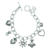 Pulsera con cadena de eslabones chicos, acompañada de varios dijes como: corazón con rosas mini, corazón flama, corazón racimo y margarita, corazón querido México chico, corazón con flama y flores, corazón con puntos, corazón con puntos mini.